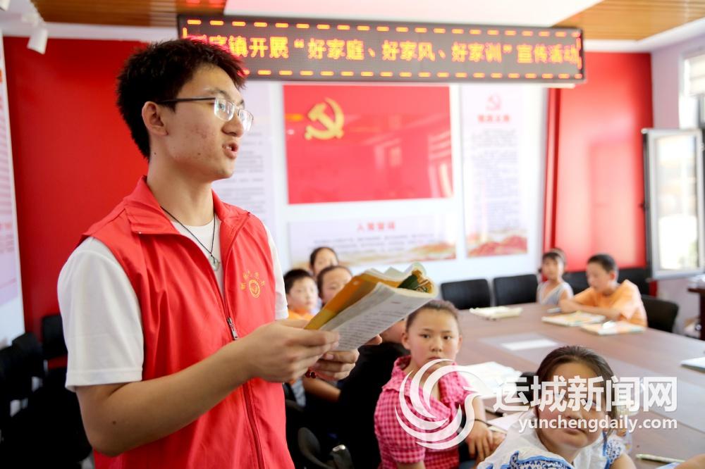 这是8月13日,闻喜县畖底镇栗村的村委会新时代文明实践站内,大学生志愿者贾子昊为孩子们讲解传统文化的一幕。