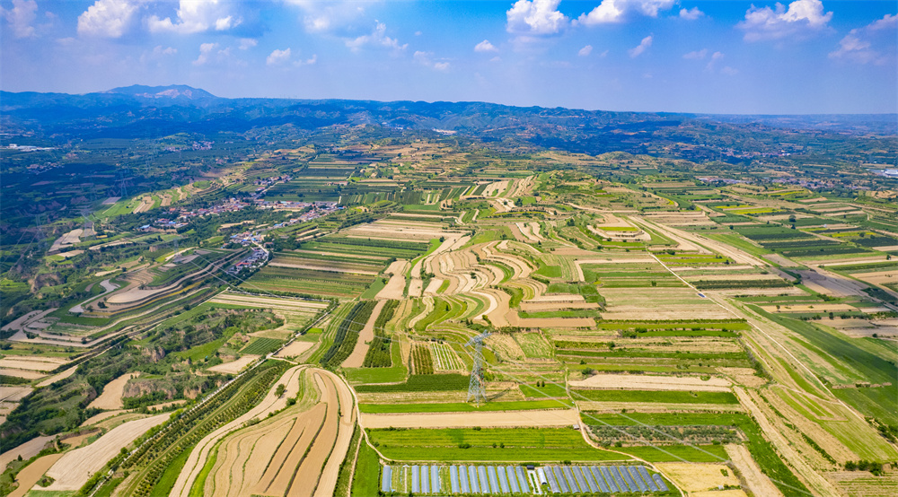俯瞰夏县水头镇一带梯田美景,山间地块线条分明,纵横阡陌,连绵不断,宛如掌纹隐藏在山乡深处,美不胜收。(8月15日摄) 本报记者 常 奇 摄