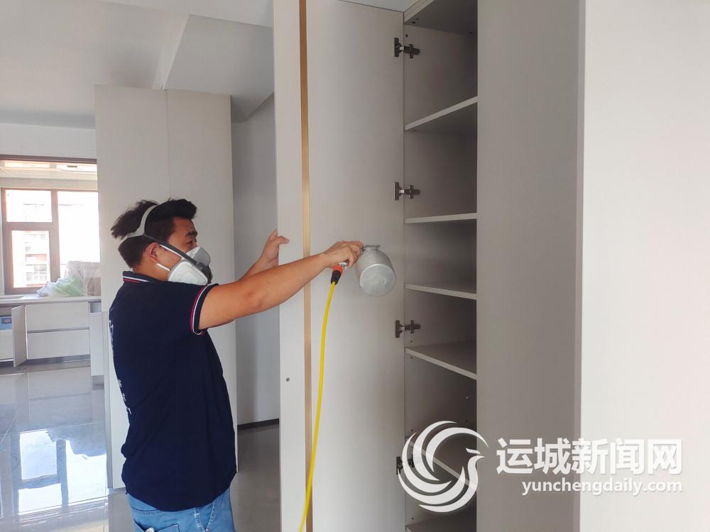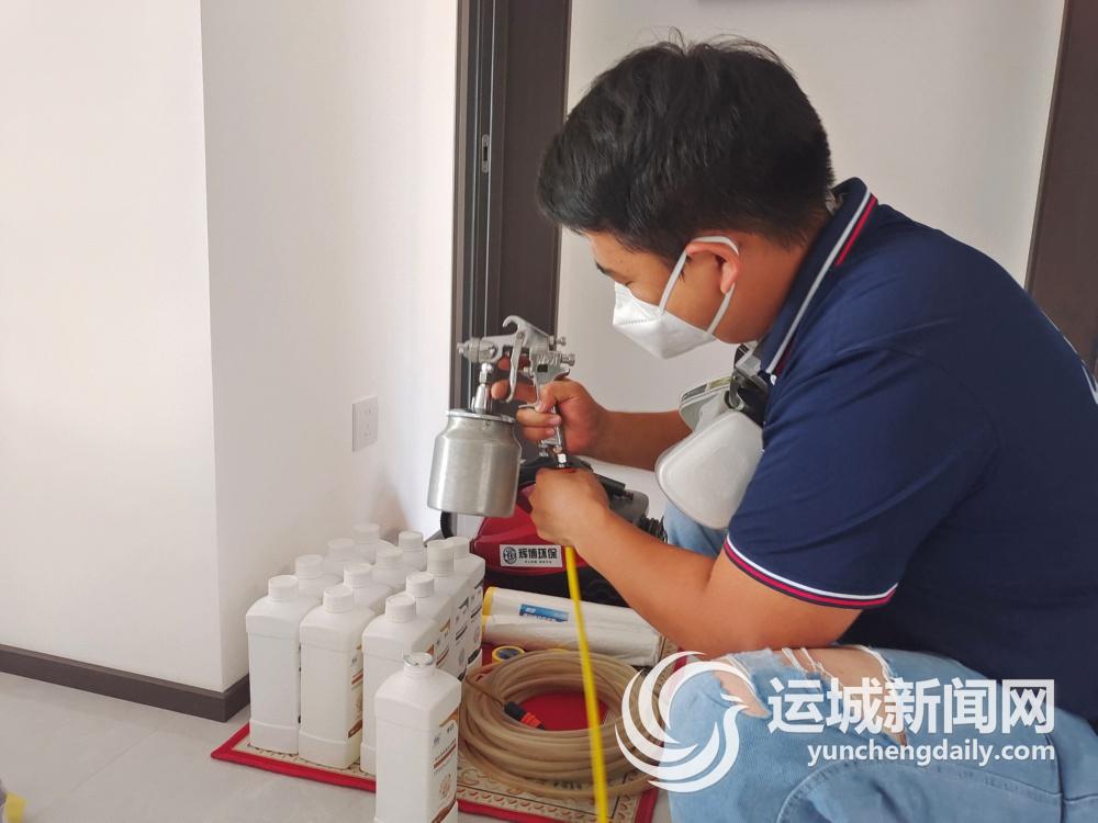 “这户是昨天检测的,在密闭门窗12个小时后,每个房间测出的数值都在0.2mg/m³以上,远超标准限值了。趁着天气好,室内温度和适度较高,抓紧时间喷涂治理。”8月19日,山西辉博环保科技有限公司施工负责人史轲带领施工人员,在御景华庭小区一户业主家进行全屋甲醛、苯等有害物治理及除味作业。
