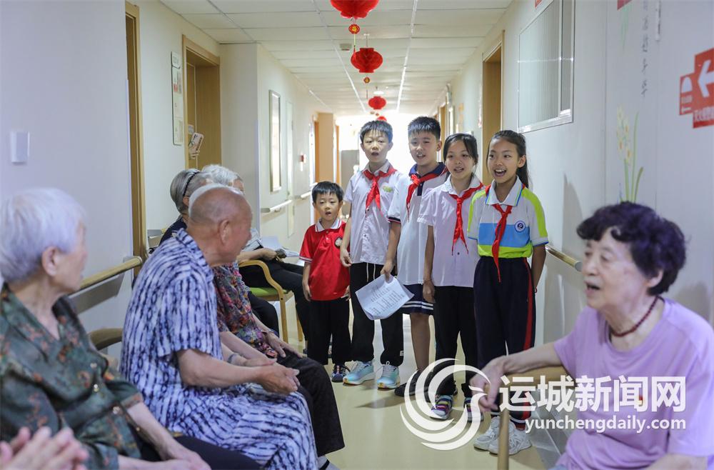 暑假里盐湖区的几名小学生自发组织来到禧康华荣老年公寓开展志愿服务活动,为老年人表演节目。