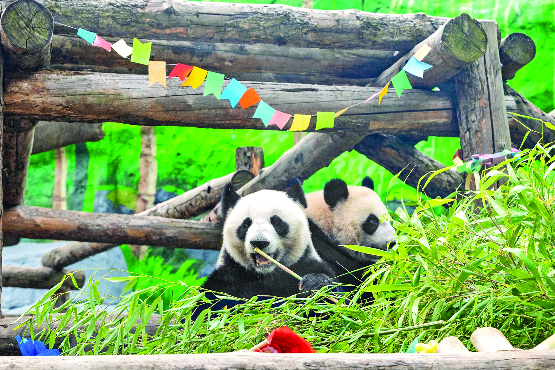 首只在俄罗斯出生的大熊猫“喀秋莎”8月24日在莫斯科动物园迎来周岁生日。这是8月24日在俄罗斯莫斯科动物园拍摄的大熊猫“喀秋莎”(右)和妈妈“丁丁”。