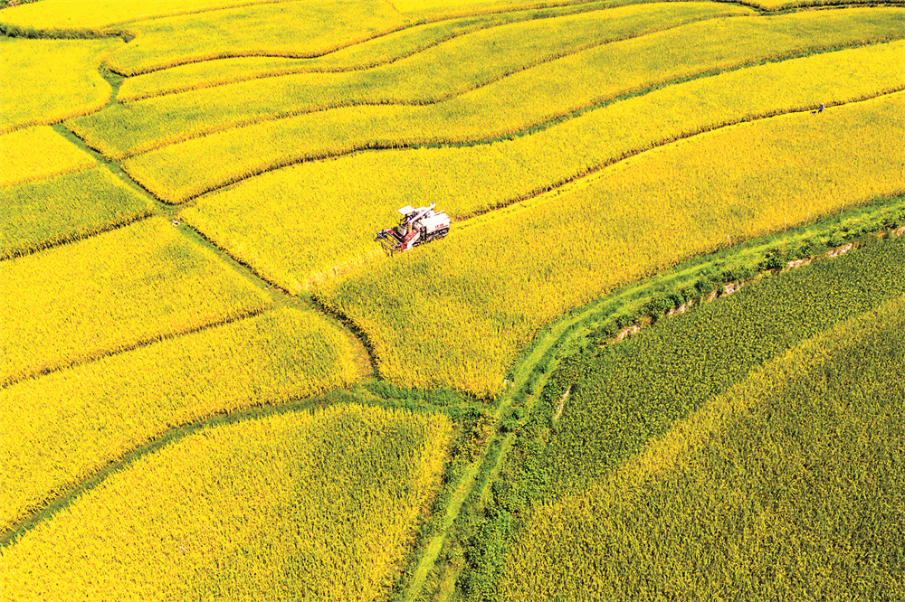 8月24日,在湖南省娄底市双峰县井字镇铜梁村,农民驾驶农机收割中稻(无人机照片)。 新华社发(李建新 摄)