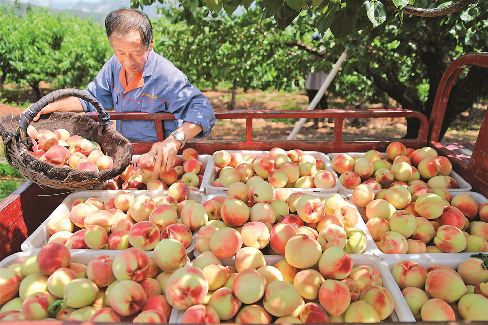 8月24日,河北省承德市承德县下板城镇乌龙矶村果农在果园采摘鲜桃。新华社发(刘环宇 摄)