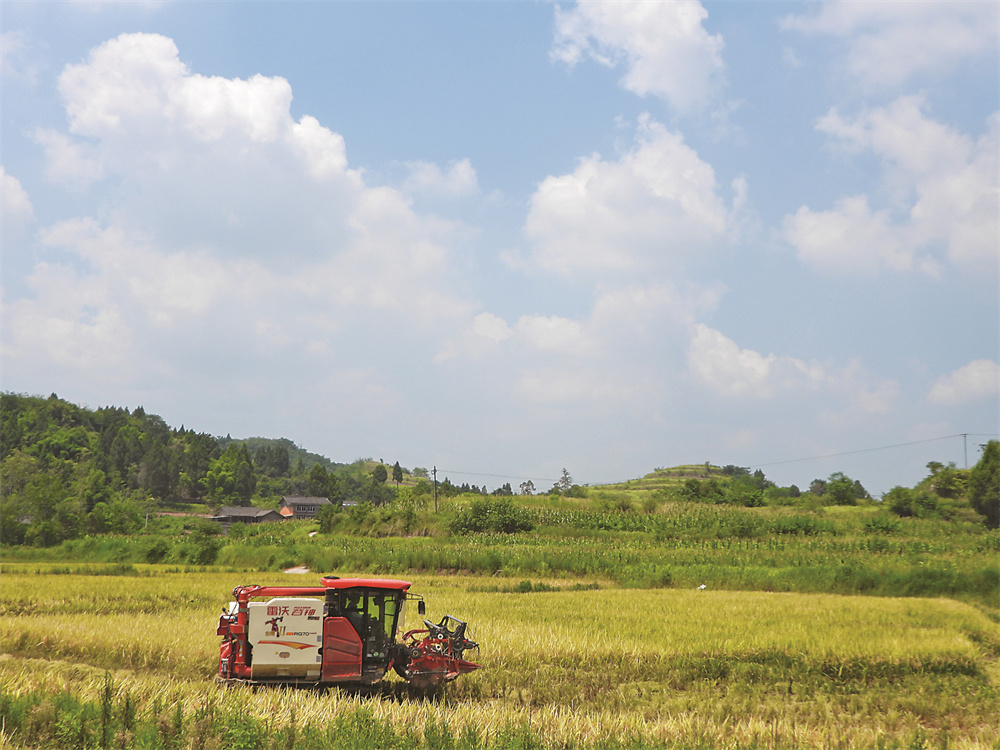 8月24日,在四川省达州市渠县贵福镇园井村福家旺农场,农民驾驶联合收割机收割水稻。新华社发(邓良奎 摄)