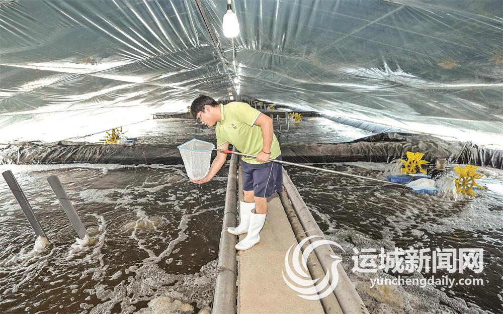 8月23日,养殖员在运城海晟源新能源数字化盐碱渔业养殖产业园查看南美白对虾生长情况。