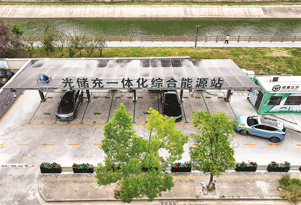 近日,国网南京供电公司联合南京市秦淮区光华路街道建设的四方新村“光储充一体化”智能充电站投运,有效缓解小区居民新能源汽车的充电难题。据介绍,该充电站集光伏发电、储能、汽车充电于一体,通过低压接入电网,建有一座光伏雨棚,配有两套海绵储充柜,可同时为8辆新能源汽车充电。日间,光伏雨棚所发电能会优先供给车辆充电,余下电能存入储能系统。通过海绵电力技术,系统会优先使用充电桩和储能装置消纳光伏所发电能。 新华社记者 季春鹏 摄