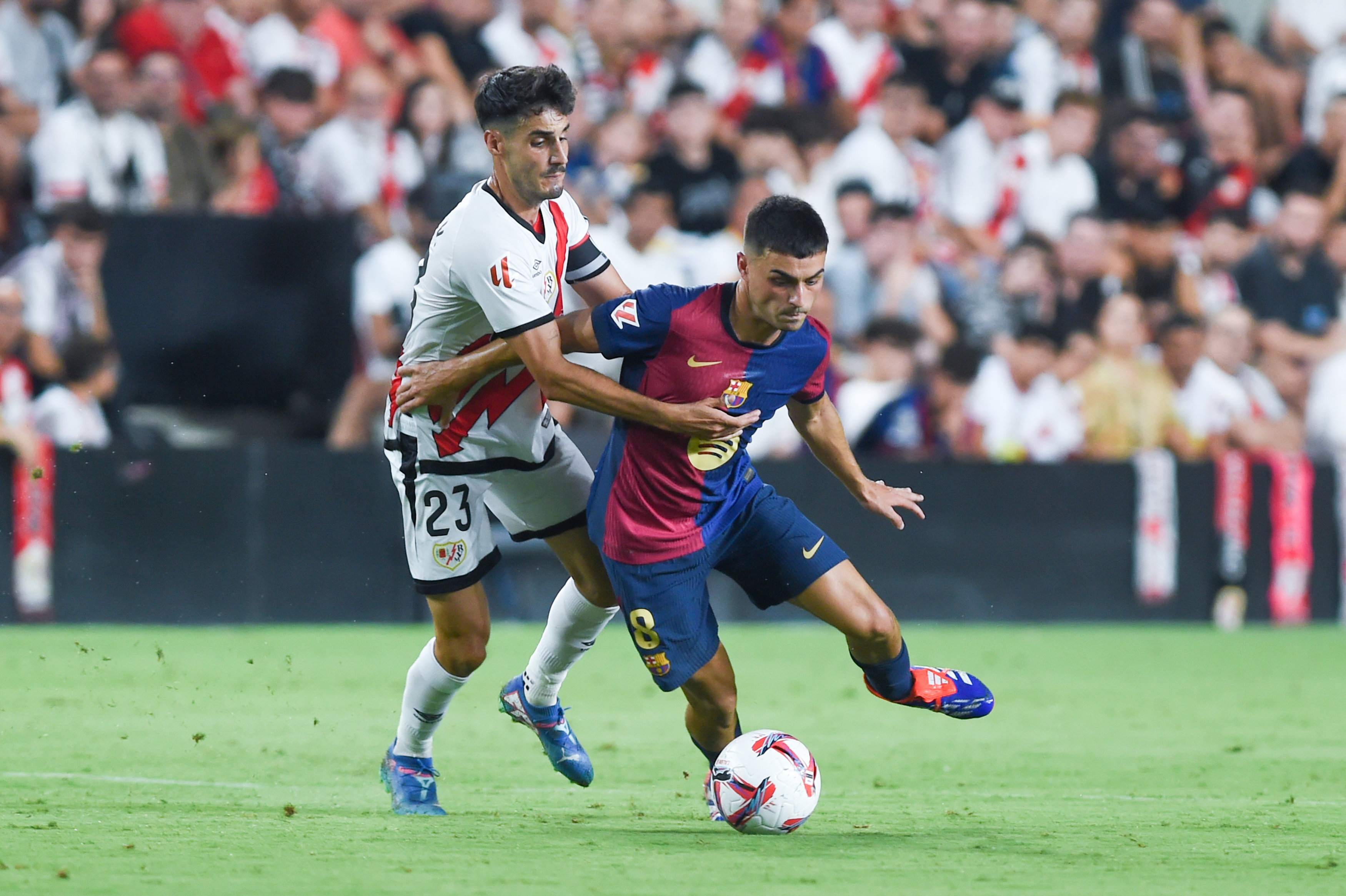 8月27日,巴塞罗那队球员佩德里(右)与巴列卡诺队球员巴伦廷在比赛中拼抢。