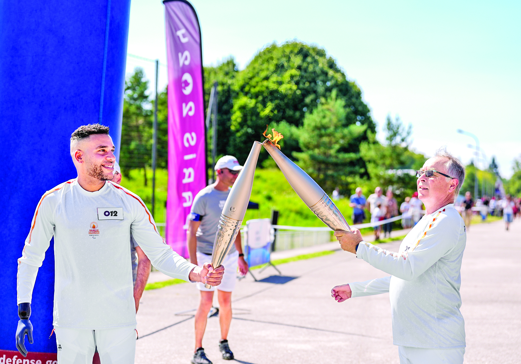 ▲8月27日,火炬手帕斯卡尔·贝朗热(右)和阿兰·阿卡波进行火炬传递。当日,巴黎残奥会火炬在法国枫丹白露传递。 新华社记者 连漪 摄