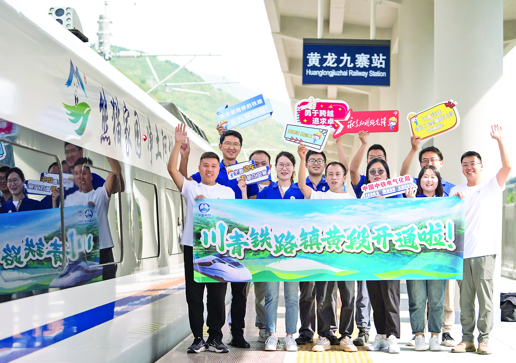 8月30日,参与川青铁路镇江关至黄胜关段修建的中国中铁电气化局员工在黄龙九寨站首发列车前留影。