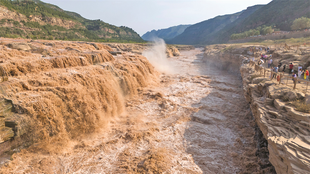 游客在黄河壶口瀑布景区游览(8月29日摄)。