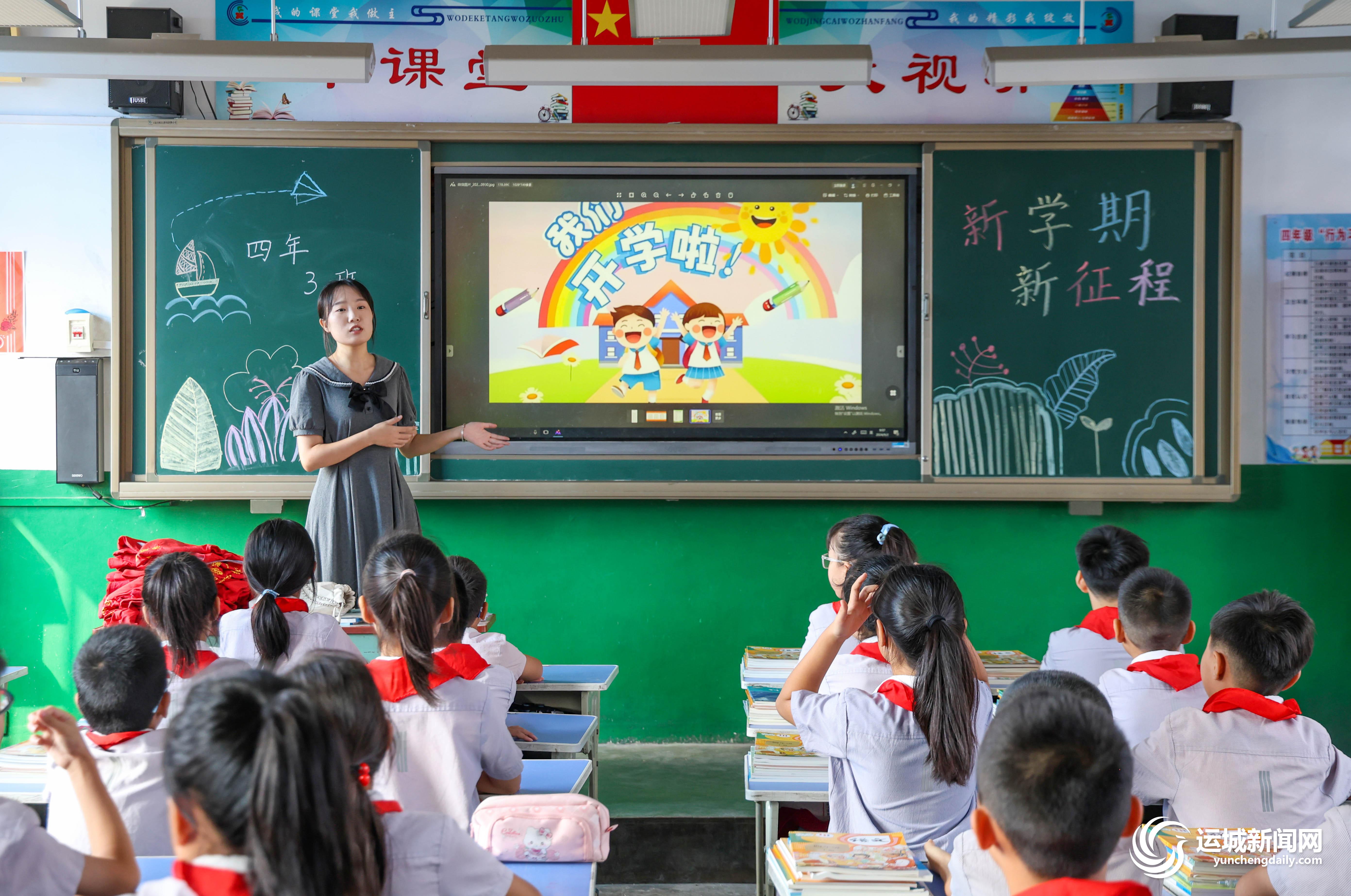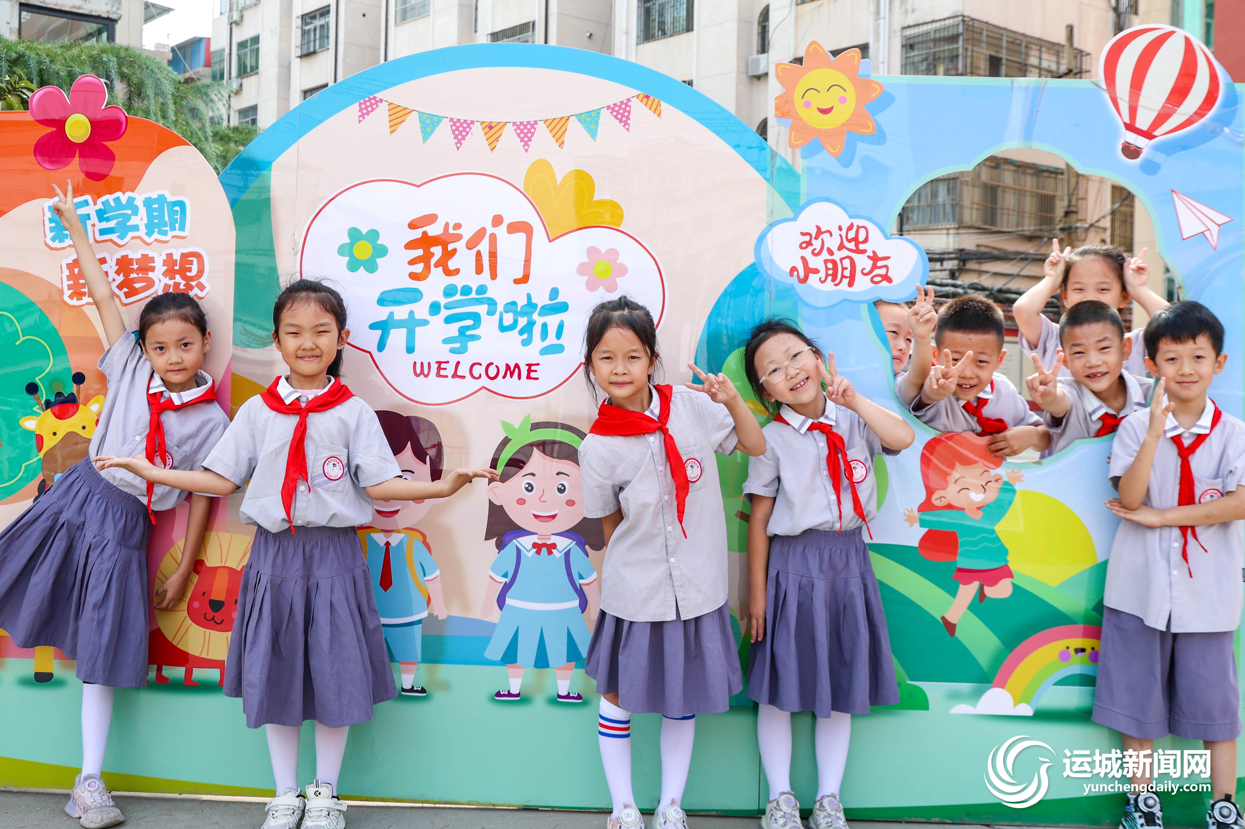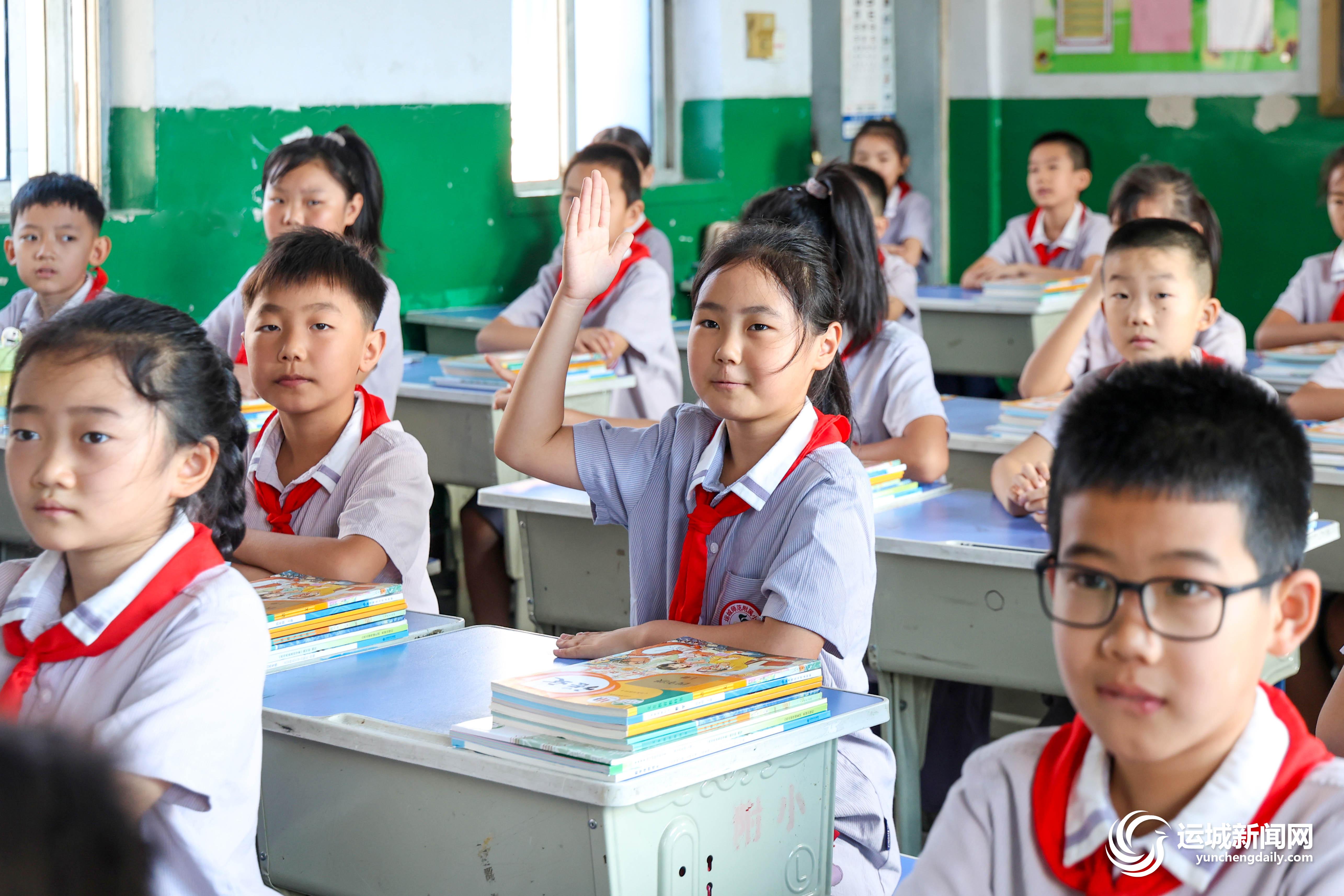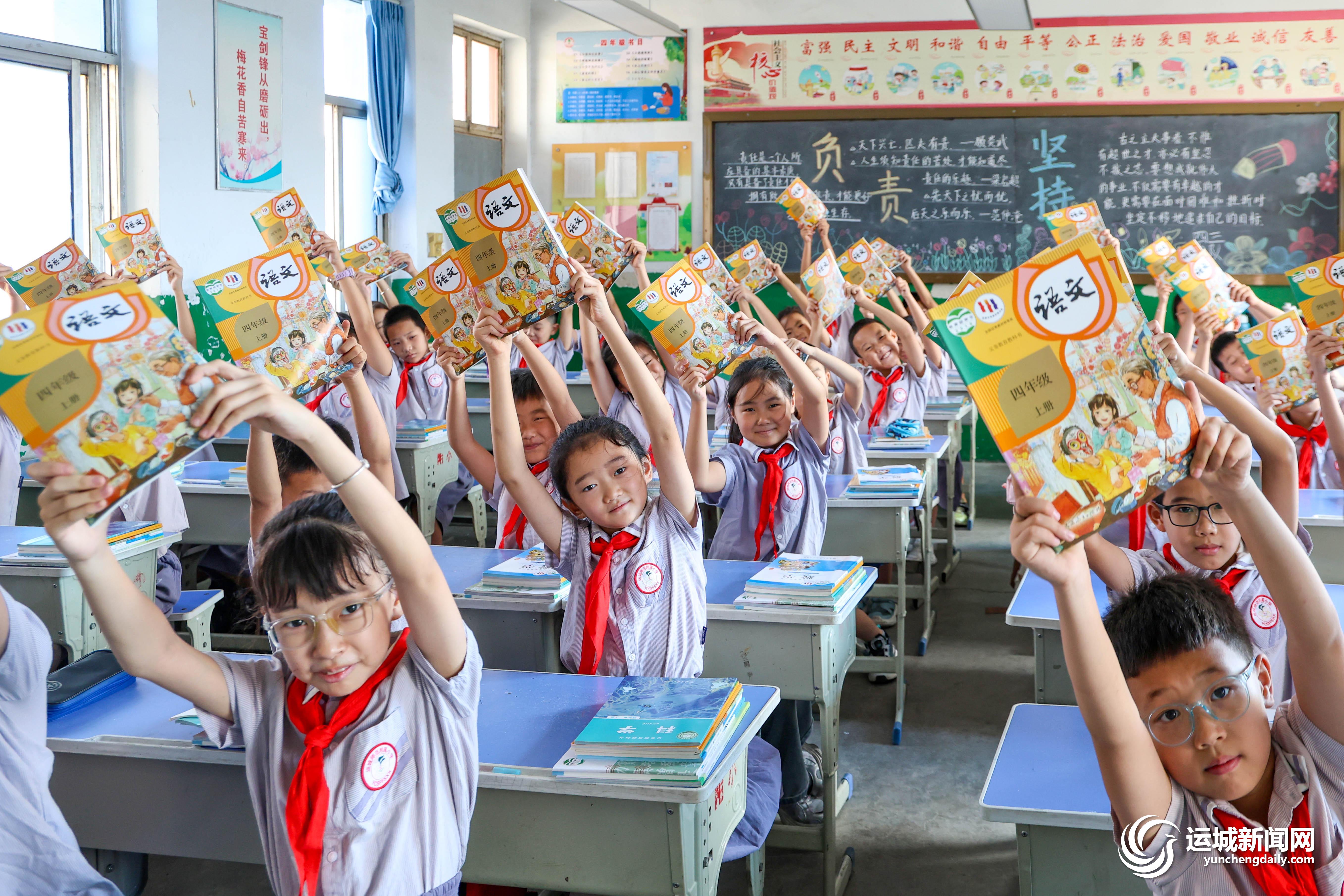 9月2日,运城师范学校附属小学的学生们展示刚刚领到的新课本。