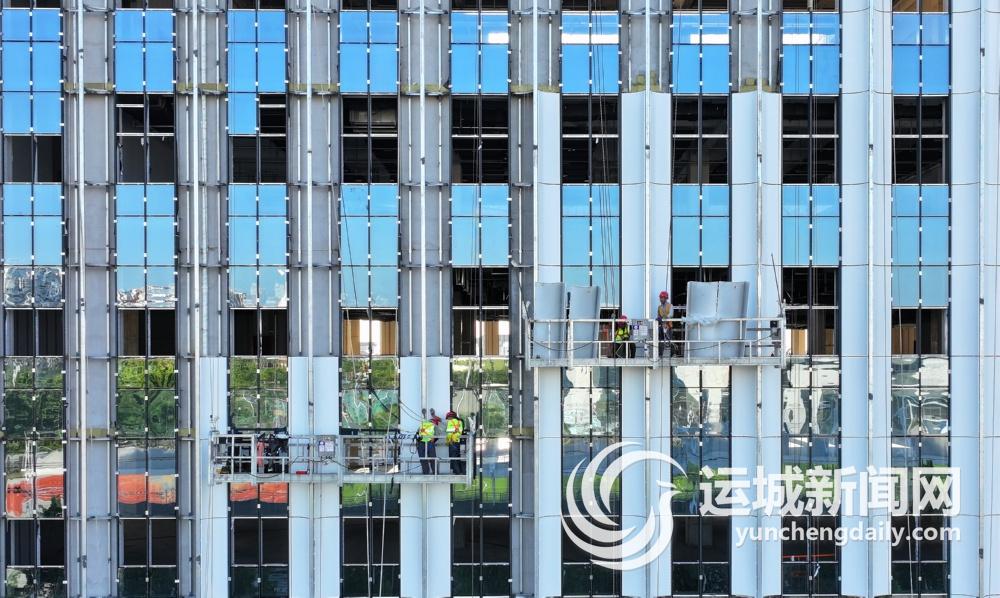 近日,建筑工人在稷山县工人文化宫建设项目施工现场进行外部装饰,加速推进项目建设。