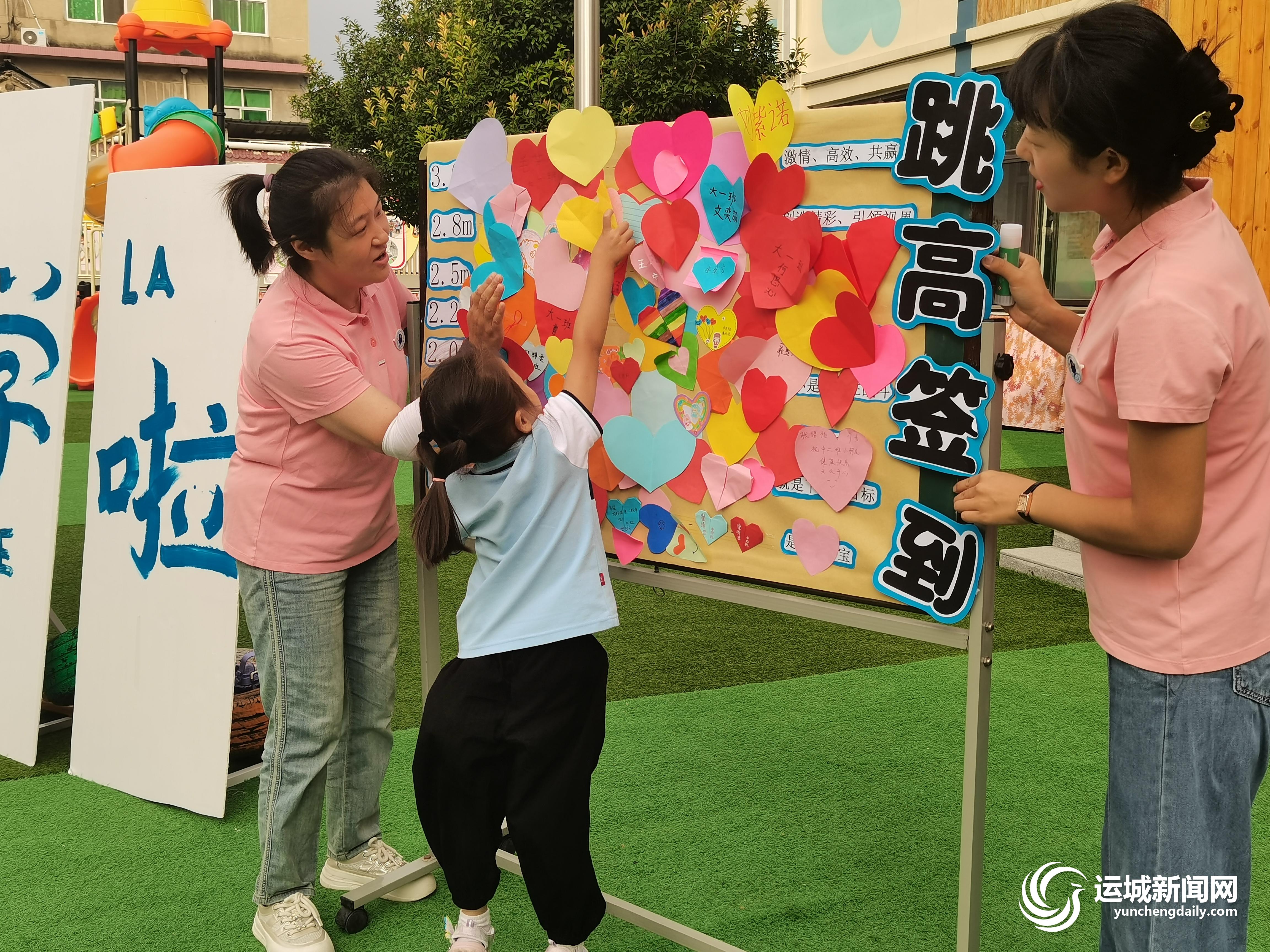 “来!到这里跳高签到吧,看看我们可以蹦多高!”有趣的游戏吸引了不少小朋友前来挑战,他们拿着爱心贴纸奋力一跃,瞧!已经贴到最高处了。