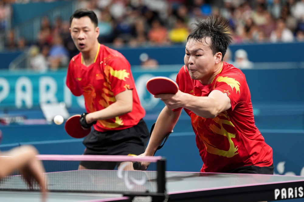 9月1日,在巴黎残奥会乒乓球男双14级决赛中,中国组合廖克力/闫硕(右)3比1战胜泰国组合,夺得冠军。