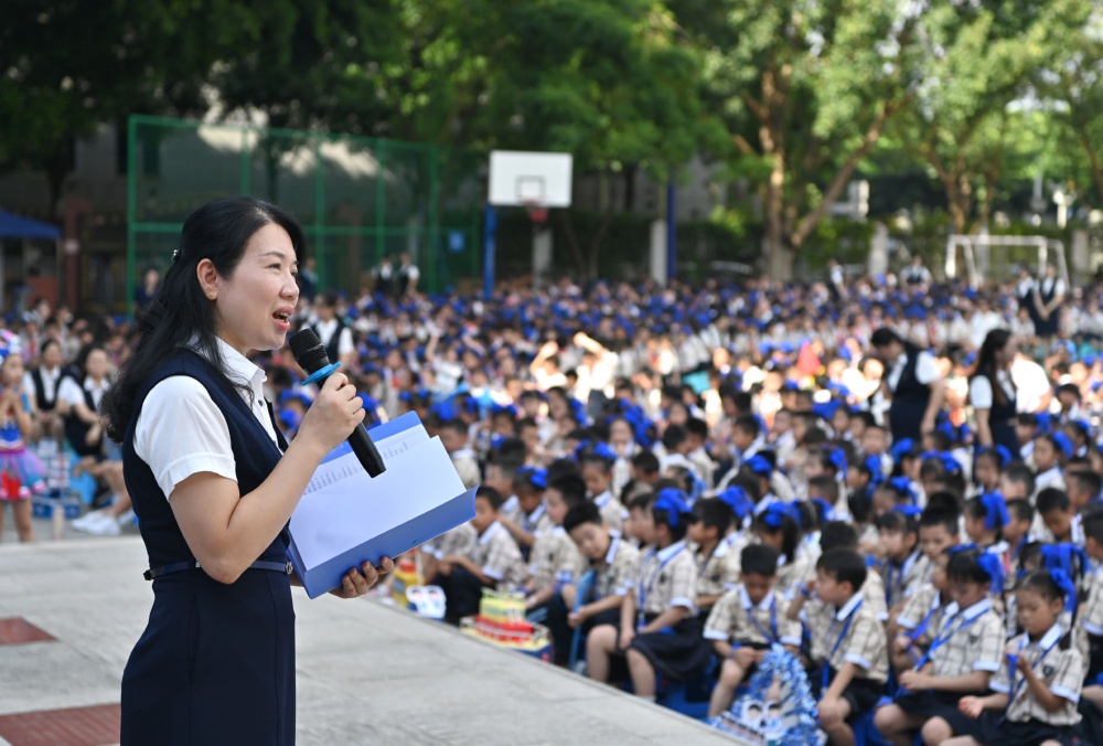 9月2日,广西南宁市滨湖路小学校长谢小燕在给孩子们讲思政课。