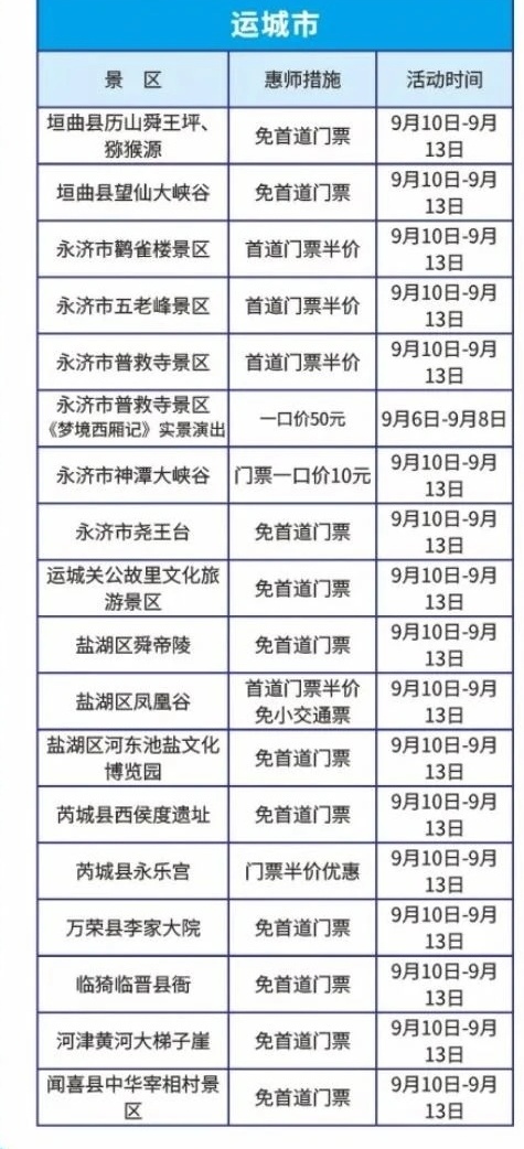 9月10日至13日,太原植物园、忻州芦芽山、长治通天峡、吕梁蔡家崖、临汾晋国博物馆和永济鹳雀楼51个历史文化景区、红色革命纪念馆及自然风光景点,在教师节期间推出免票或门票半价等优惠活动。其中,包括我市18家景区。