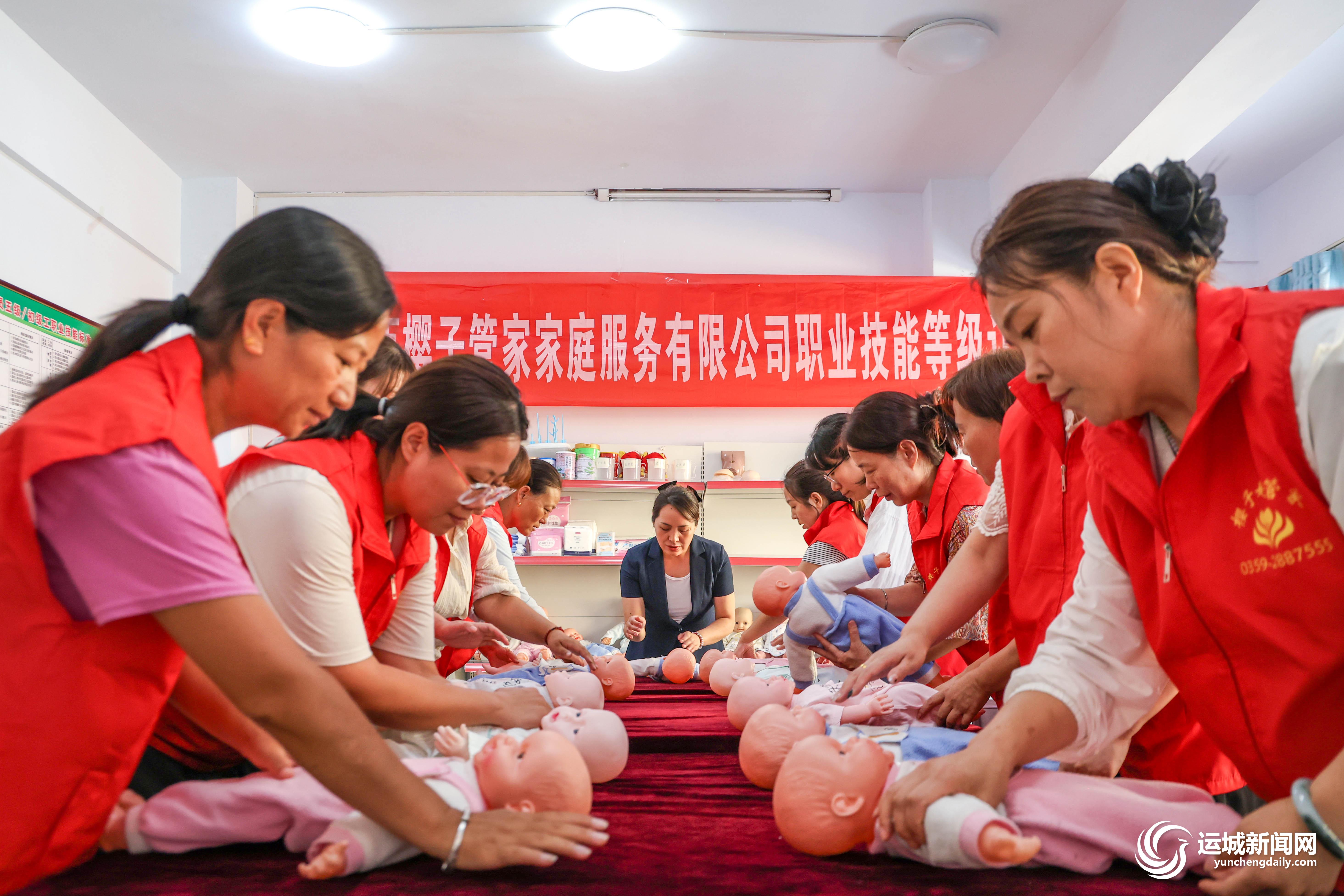 9月4日,在樱子管家的培训教室内,学员们在学习新生儿护理技能。