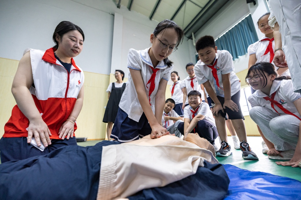 9月4日,在浙江省湖州市吴兴区龙泉小学,学生在医护人员指导下学习心肺复苏技能。
