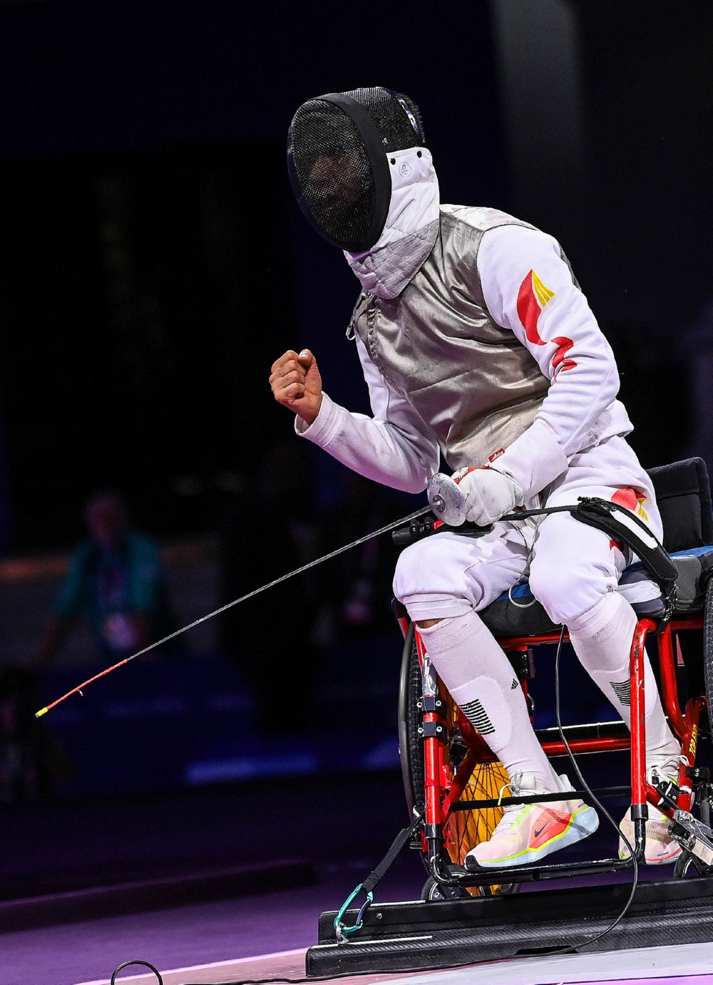 当日,在巴黎残奥会男子花剑个人A级决赛中,中国选手孙刚15比3战胜意大利选手贝蒂,获得冠军。