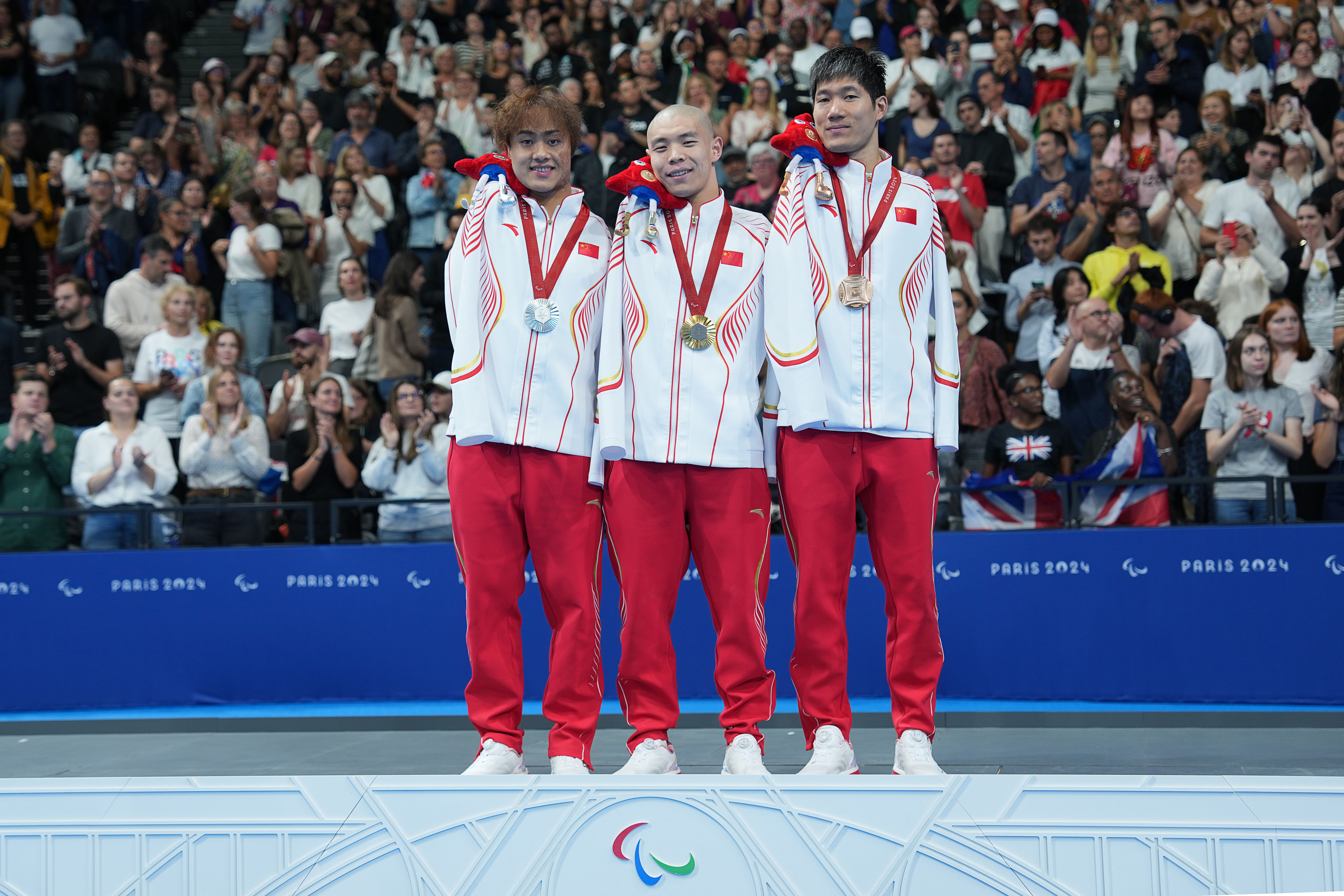 当日,在巴黎残奥会游泳男子50米自由泳S5级决赛中,中国选手郭金城、袁伟译、王李超包揽冠亚季军。