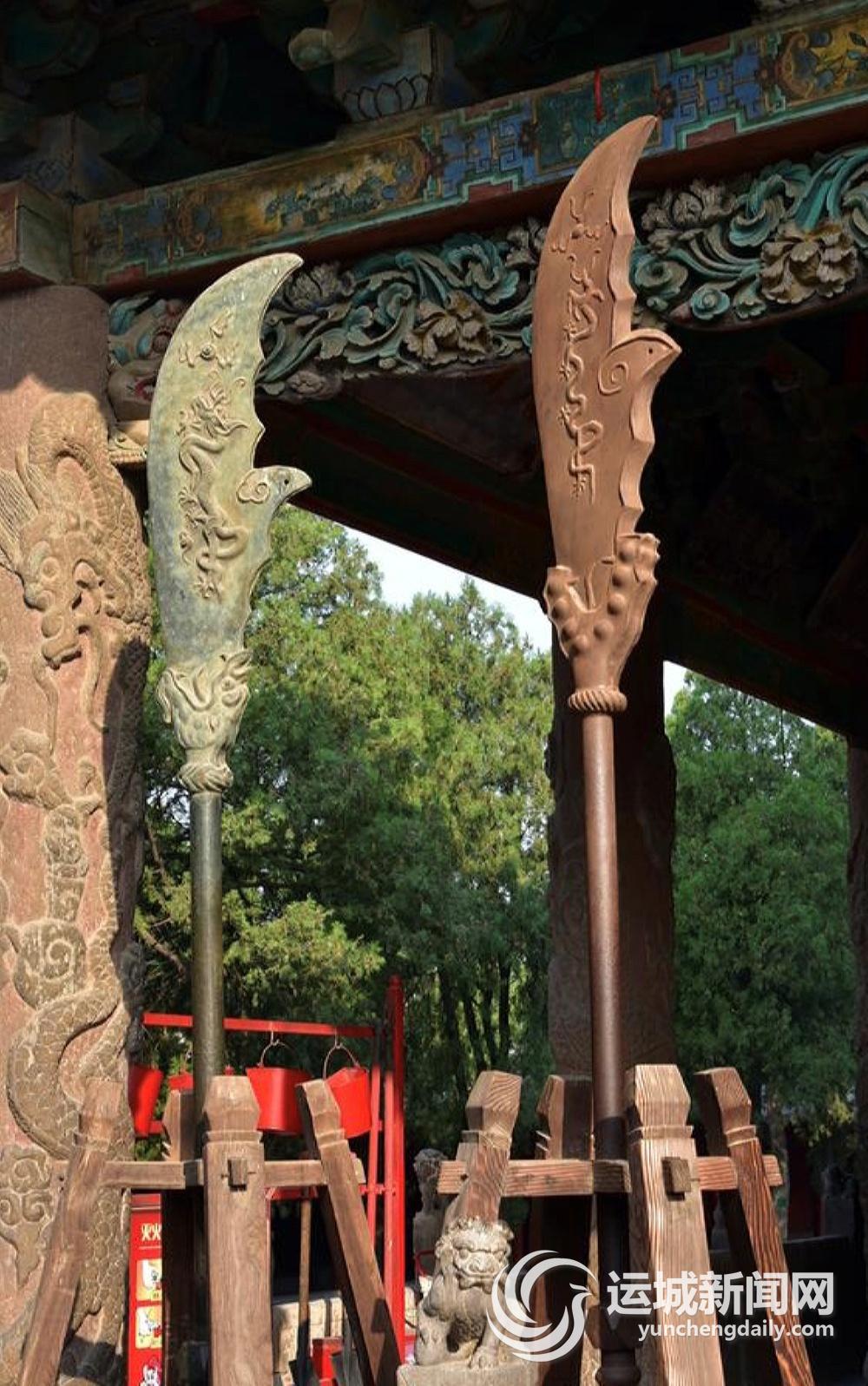崇宁殿前东侧,有三把后人仿制的高4米、重300斤的青铜和铁铸成的青龙偃月刀。