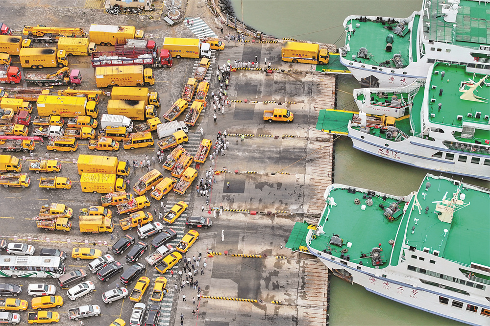 9月7日,在广东省徐闻县海安新港,南方电网公司第二批支援海南抢修复电的人员和车辆等待登船渡海(无人机照片)。