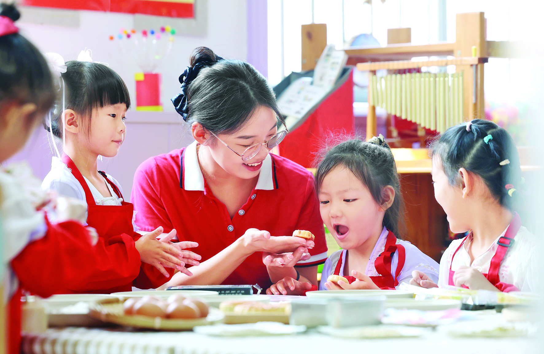 9月4日,在河北省石家庄市藁城区通安幼儿园,老师和小朋友一起制作手工月饼。