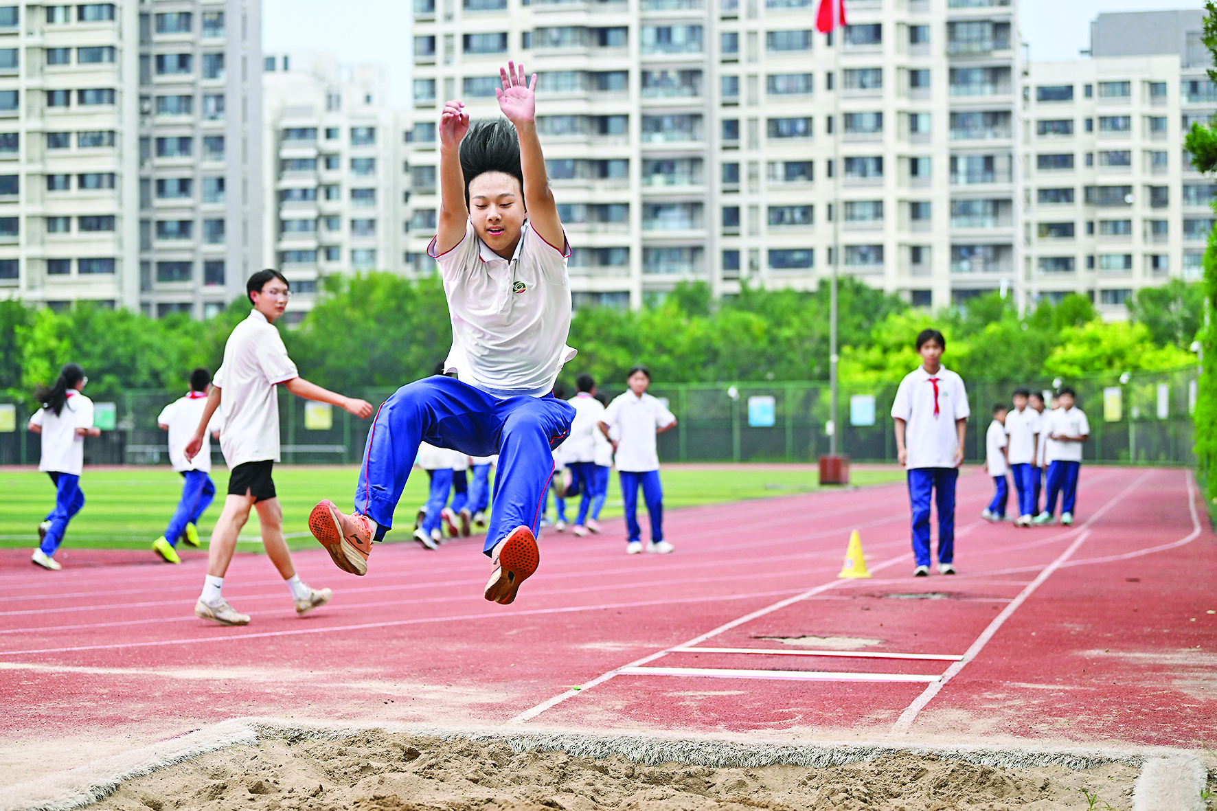 9月4日,天津市滨海新区塘沽育才学校,学生利用大课间在操场上跳远。 新华社记者 李 然 摄