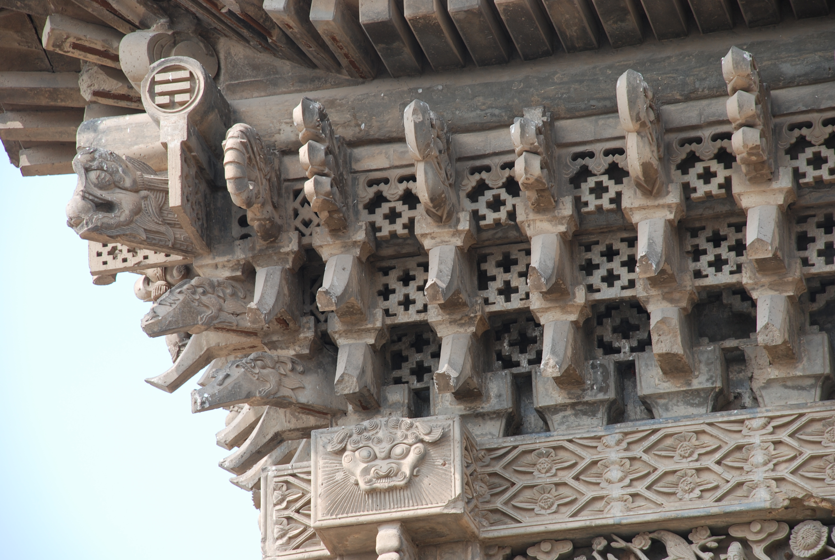 阮氏双碑楼位于运城市河津市小梁乡西梁村中,座西北朝东南,为清光绪例赠武德佐骑尉阮廷实与其子阮陵云德行碑楼,建于清光绪三年(1877年),砖雕仿木结构。双碑楼形制相同,相距1.27米,方形砖砌台基,台基高2.6米,边长3.51米,通高约8.7米,四面均施阶条石。四边方形砖角柱,须弥式方鼓形柱础。四面均有匾额、石刻楹联,下额枋有浮雕二龙戏珠、缠枝花卉图案,上额枋浮雕故事人物,平板枋雕二方花卉连续图案。檐下有五踩双昂如意斗拱,龙形、卷叶耍头相间,转角斗拱正面为象鼻子耍头。角柱上均施浮雕武士人物,匾额两侧浮雕文官人物。各楹联上施虎头,下施牡丹。单檐歇山顶,施素版筒瓦,二层楼阁式脊刹,龙形鸱吻。