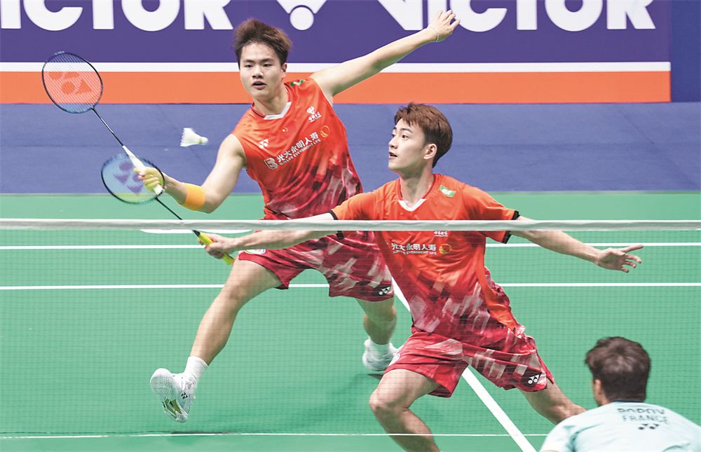 9月17日,梁伟铿/王昶(右)在比赛中。当日,在2024中国羽毛球公开赛男双首轮比赛中,中国组合梁伟铿/王昶2比0战胜法国组合克里斯托·波波夫/托马·波波夫,晋级下一轮。 新华社记者 杨磊 摄