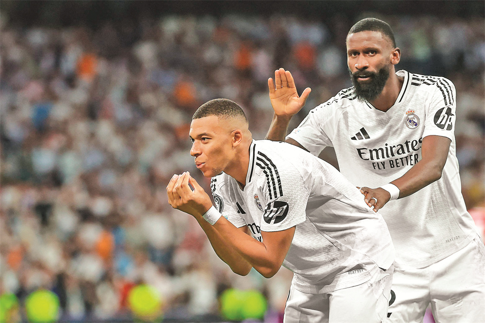 9月17日,皇家马德里队球员姆巴佩(左)进球后与队友吕迪格庆祝。