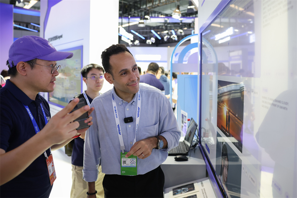 9月19日,媒体记者在“人工智能+”展馆了解AIGC视频创作应用。