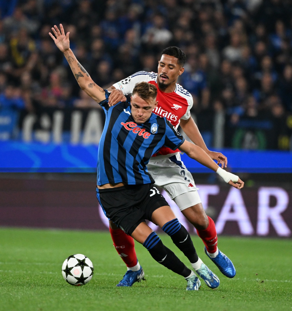 9月19日,亚特兰大队球员雷特吉(前)与阿森纳队球员萨利巴在比赛中拼抢。当日,在2024~2025赛季欧冠联赛阶段第一轮比赛中,意甲亚特兰大队主场0比0战平英超阿森纳队。