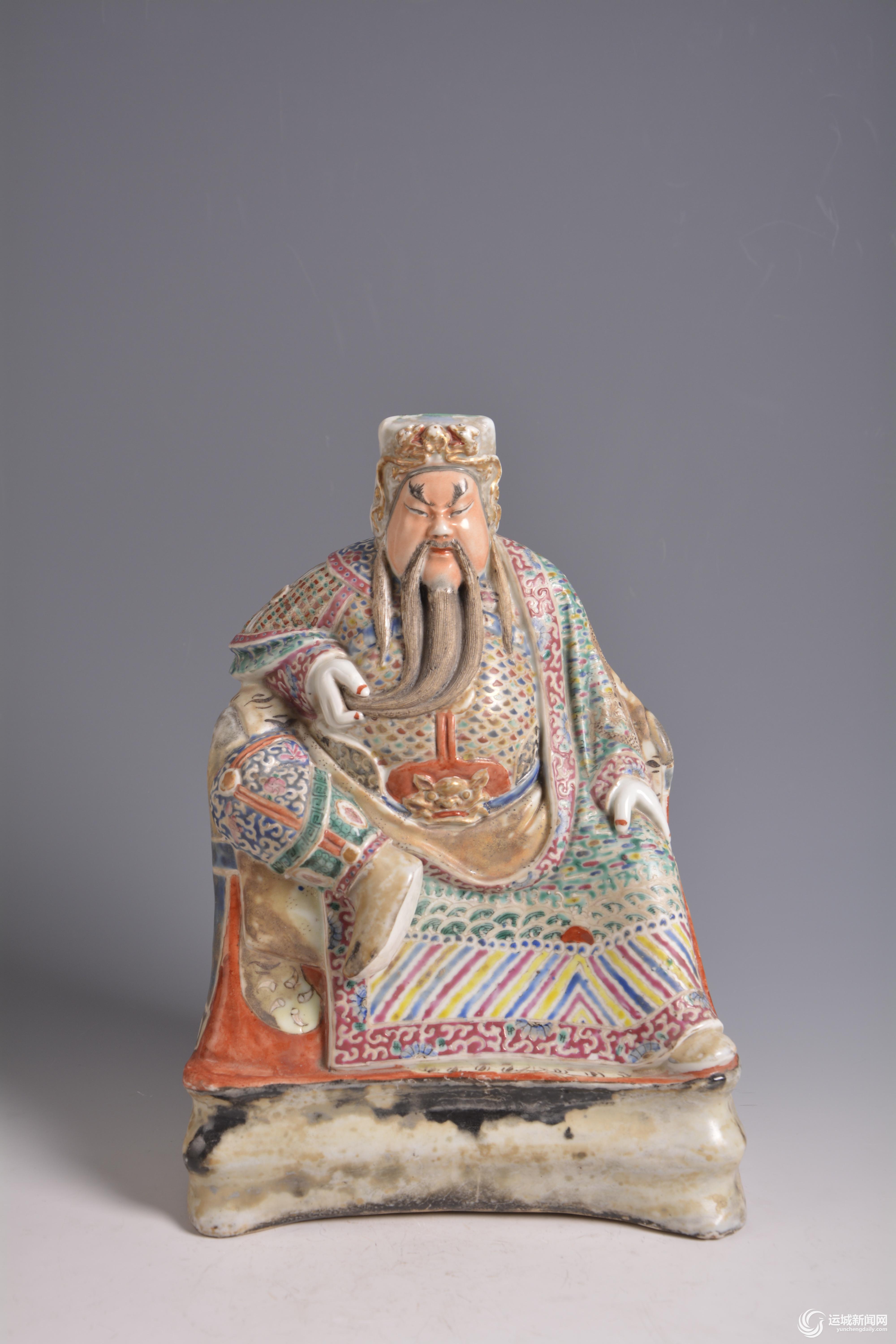 清代《粉彩关公坐像》和依据清代《粉彩关公坐像》放大制作的当代雕塑作品《万世人极》彩绘关公坐像,在人物形象塑造手法上以静写神,仿佛蕴含胸有乾坤、吐纳万物的自信,色彩上具有民间风味,也有陶瓷的质感。