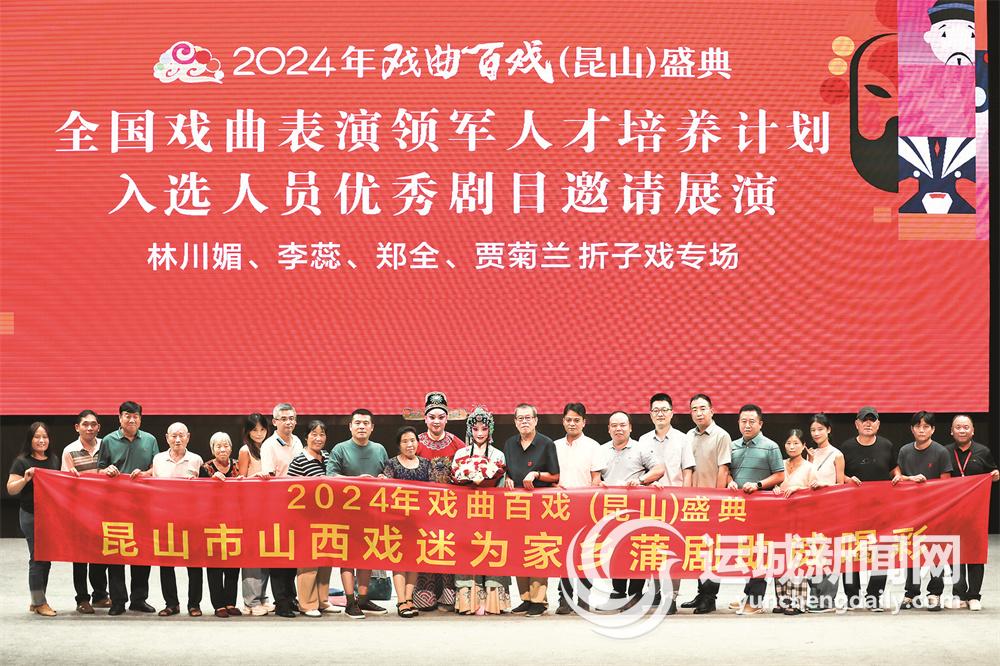演出结束后,昆山市山西戏迷打出为家乡蒲剧助威喝彩的横幅,与主演合影。摄影 姚小勇