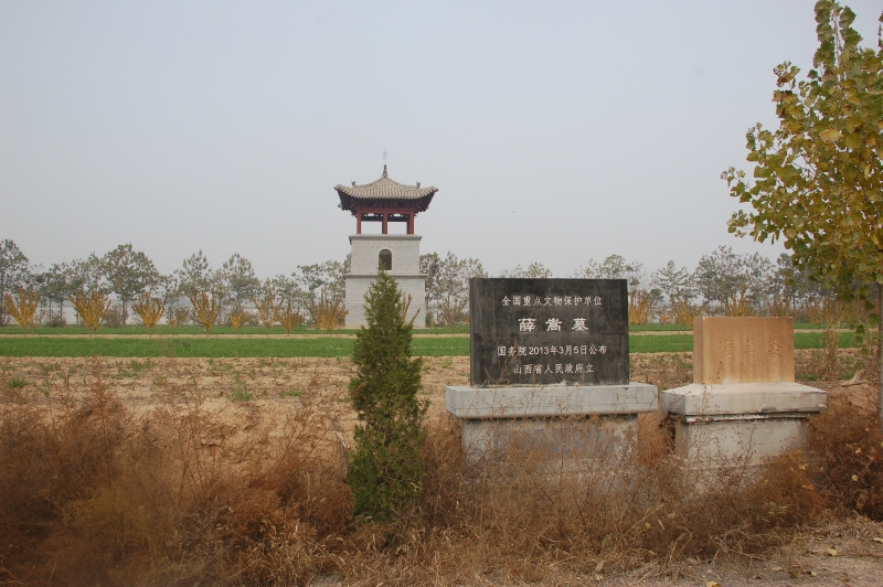 薛嵩墓位于水头镇大张村西300米处。东西500米,南北200米,分布面积约100000平方米。薛嵩(?-772),河东万泉(今山西省万荣县)人,薛仁贵之孙,曾任尚书右仆射、相州(河南省安阳市)刺史,昭义军节度使、封平阳郡王。墓地坐北面南,现存圆形封土1座,底径约24米,高约3.5米。墓前500米处立唐大历八年(773)神道碑1通,碑为青石质,螭首、方座。通高6、3米,碑文隶书,记载了薛嵩的生平事迹,由程浩撰文,韩秀实书丹。1965年,省政府公布为省级文物保护单位。2013年5月,国务院公布为全国重点文物保护单位。2015年,争取到专项经费新建碑楼一座,对薛嵩神道碑进行了妥善保护。