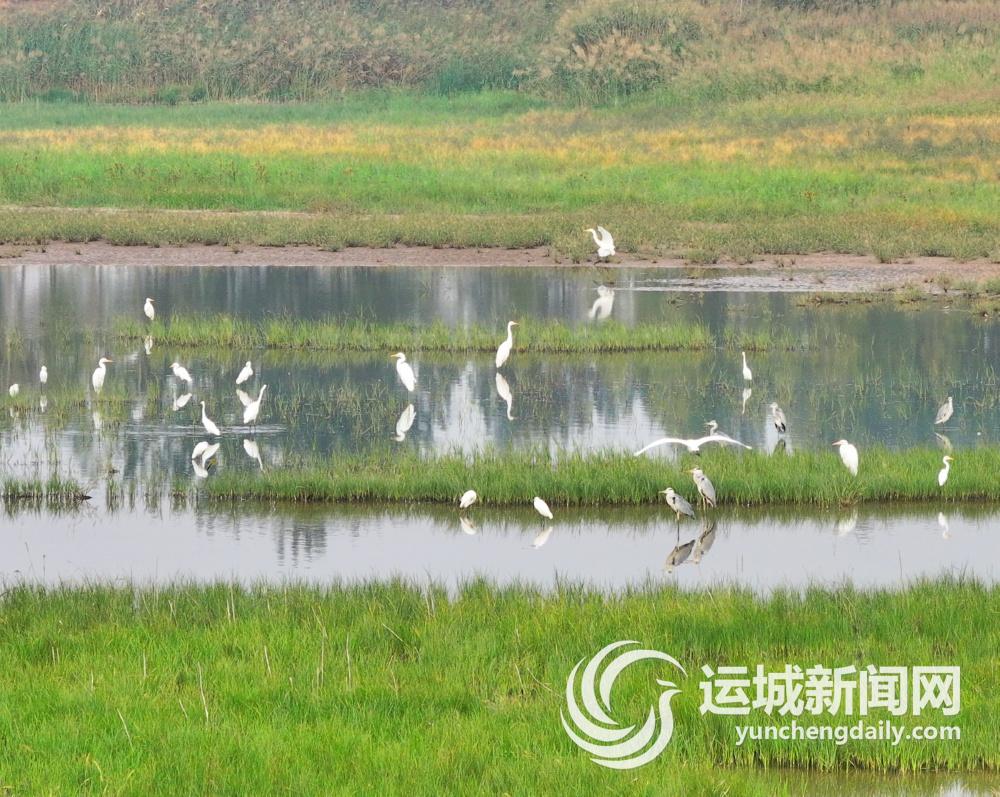 9月25日,白鹭、苍鹭在稷山县杨赵东滩汾河湿地休憩觅食。