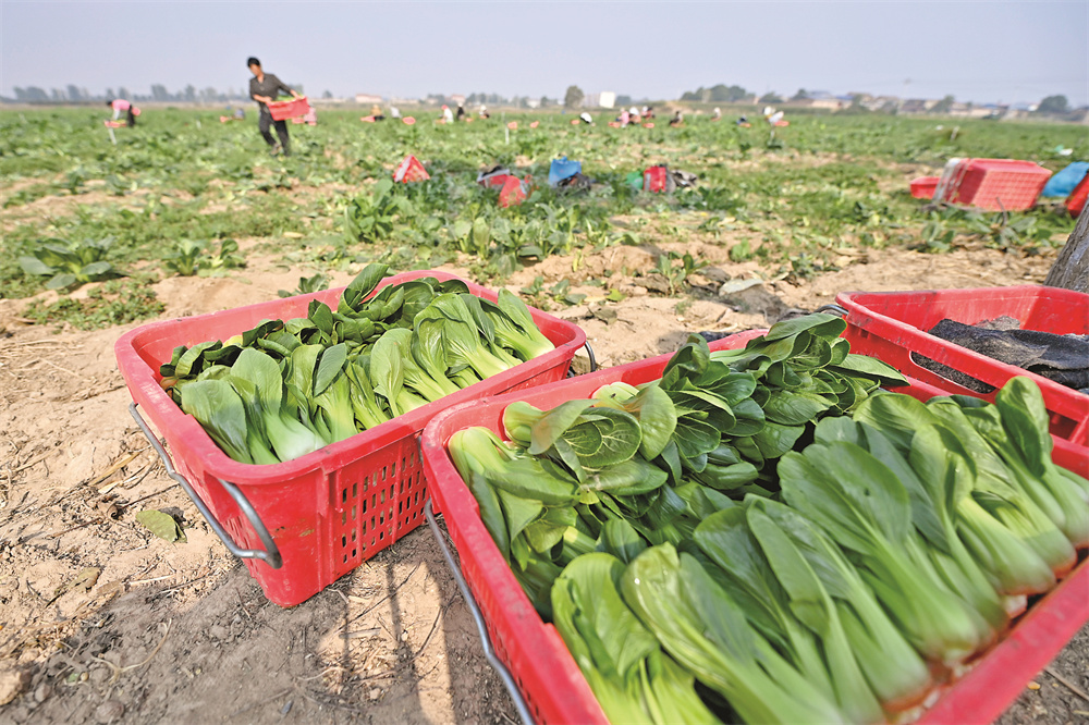在位于夏县禹王镇的供港蔬菜基地里,村民采摘上海青(9月25日摄)。