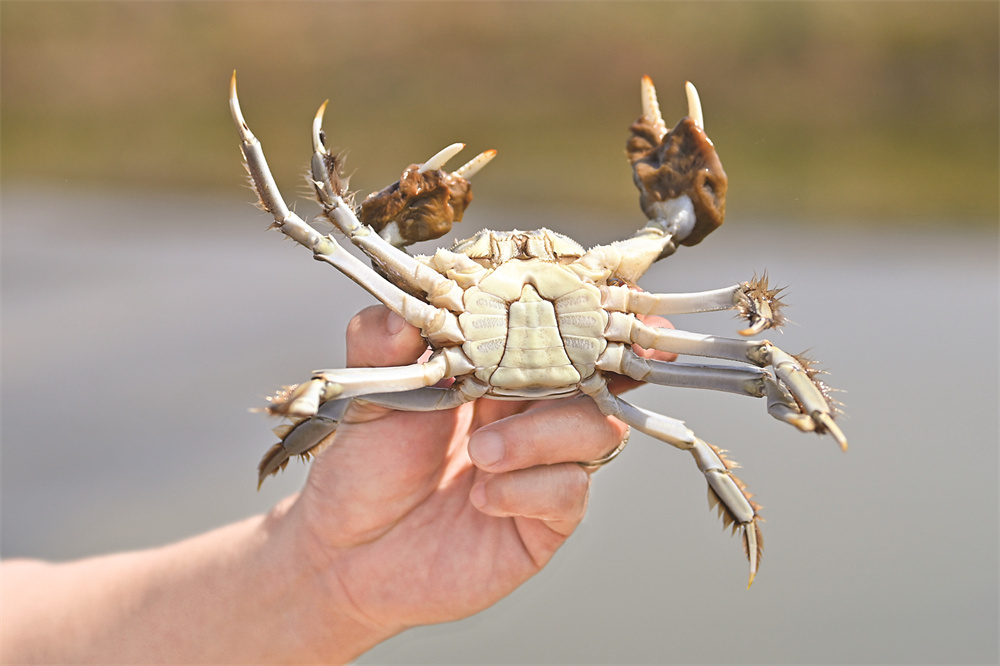 在临猗县孙吉镇薛公村,工作人员展示刚捕捞的大闸蟹(9月24日摄)。