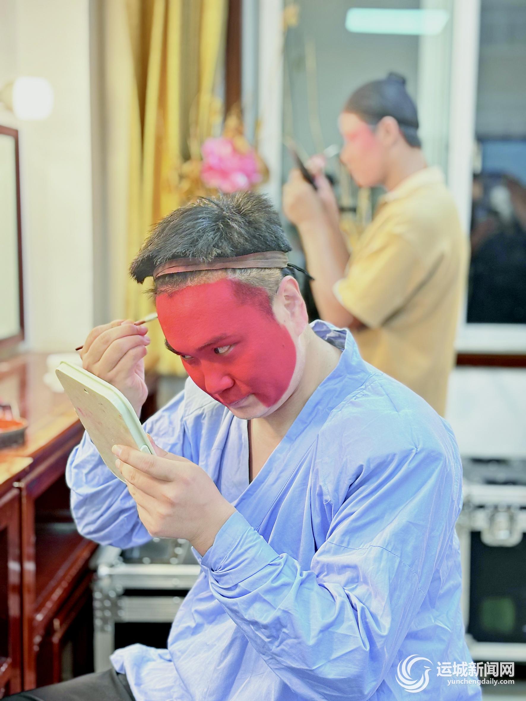 化妆、穿戏服、练习台步,演员们在为当天的演出忙碌着,热闹的后台里,赵振在一隅坐着,安静地为自己画着关公的“红脸”。
