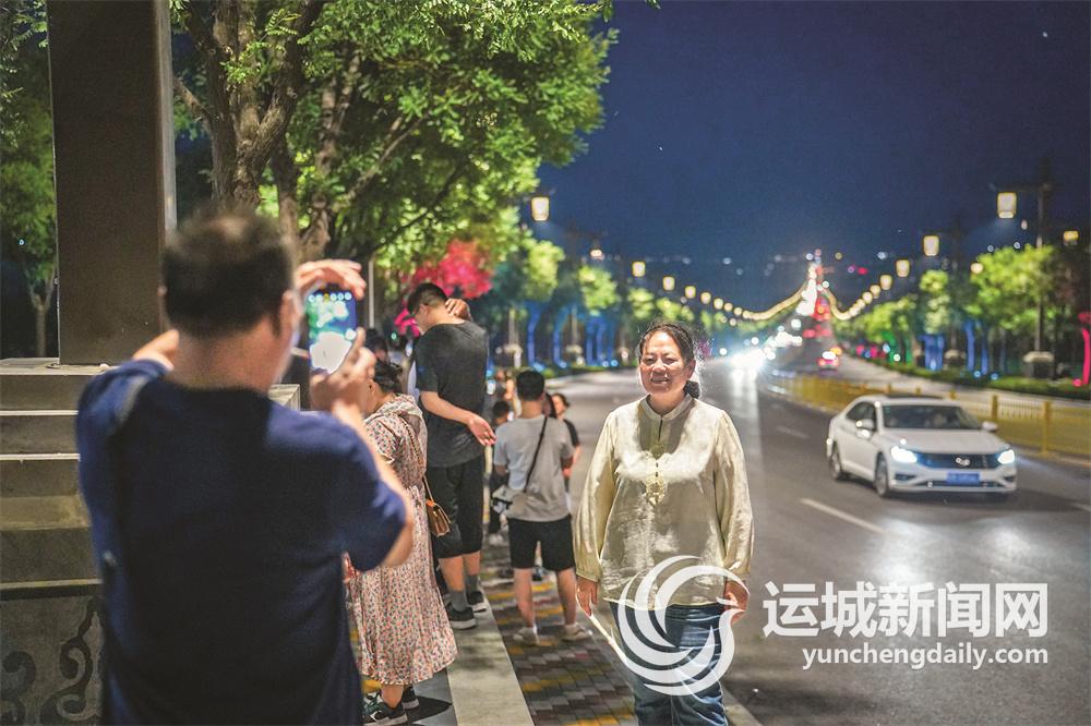 盐湖区解放南路跨湖段006号灯杆处,众多游客在“打卡”拍照。记者 陈方斌 摄