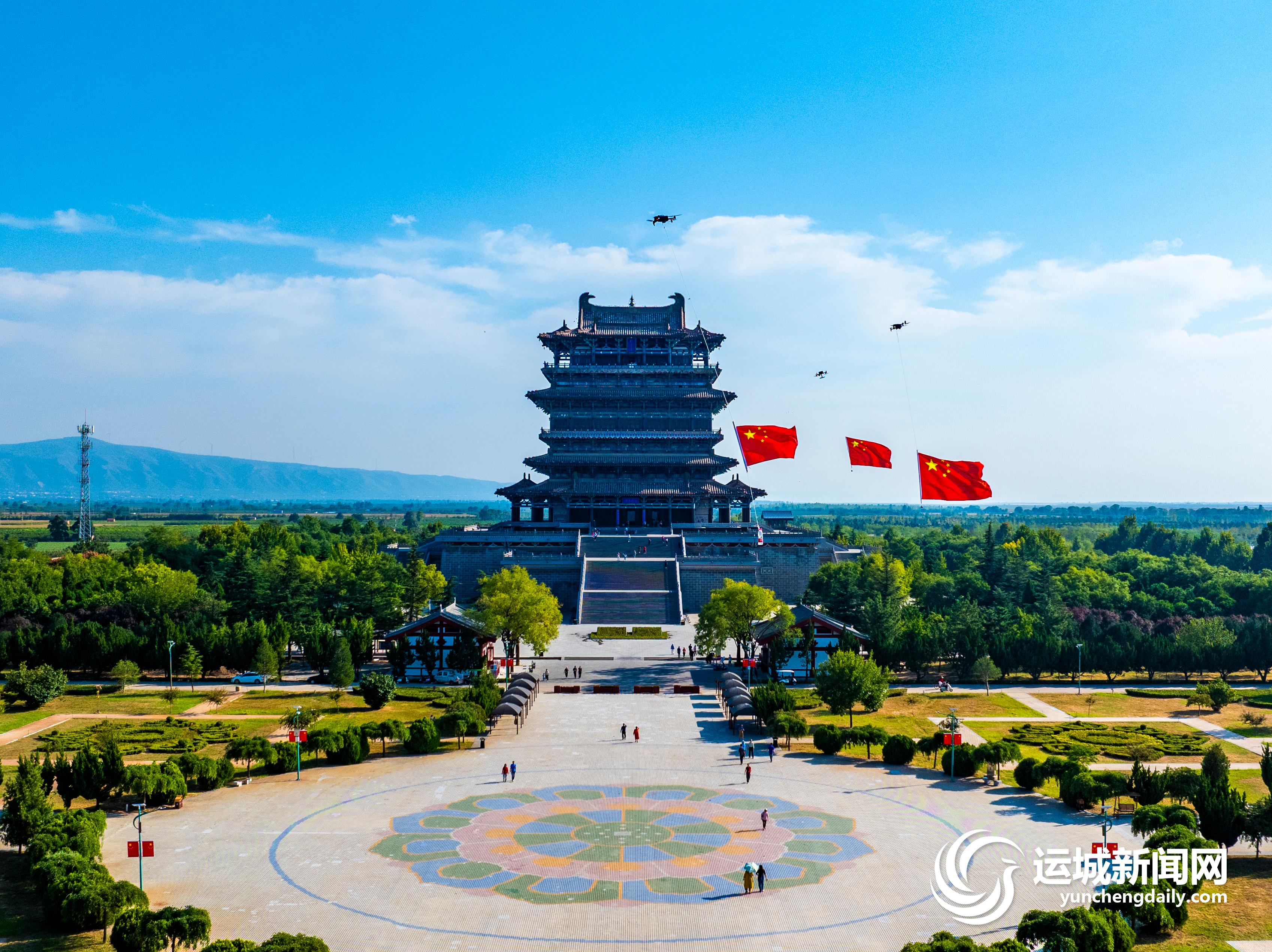 从河东大地红旗漫卷,市民、游客把国旗贴到脸上、满眼尽是中国红,到多地多人自发用无人机编队悬挂五星红旗飘过盐湖上空,飘过中条山麓,在鹳雀楼、莺莺塔上空高高飘扬;