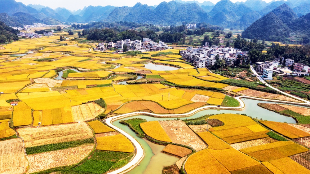 金秋时节,乡间农田与河流、群山、村落相互映衬,一步一景,美不胜收。