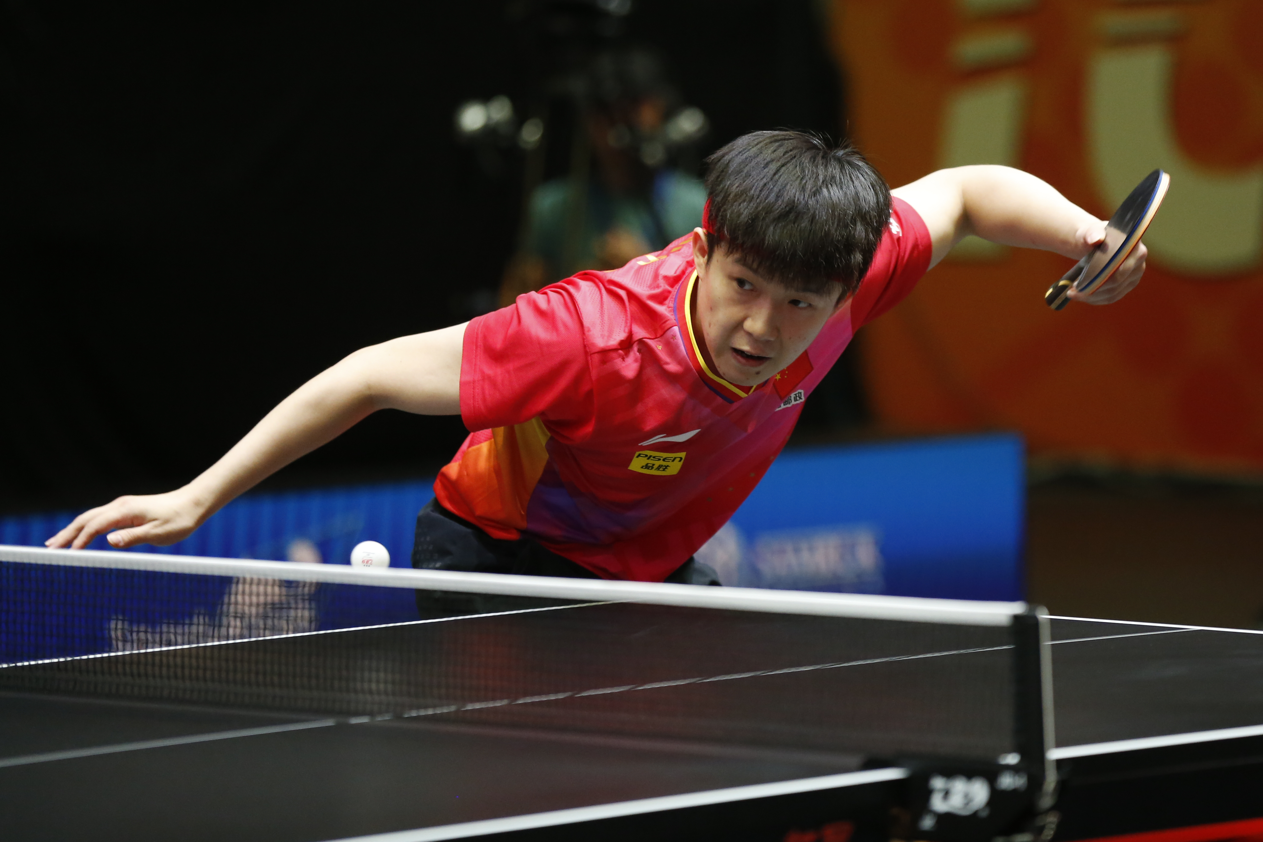 10月8日,中国选手王楚钦在比赛中发球。最终,他3比1战胜伊朗选手阿拉米扬。当日,在哈萨克斯坦阿斯塔纳举行的2024年乒乓球亚锦赛男子团体四分之一决赛中,中国队3比1战胜伊朗队,晋级半决赛。