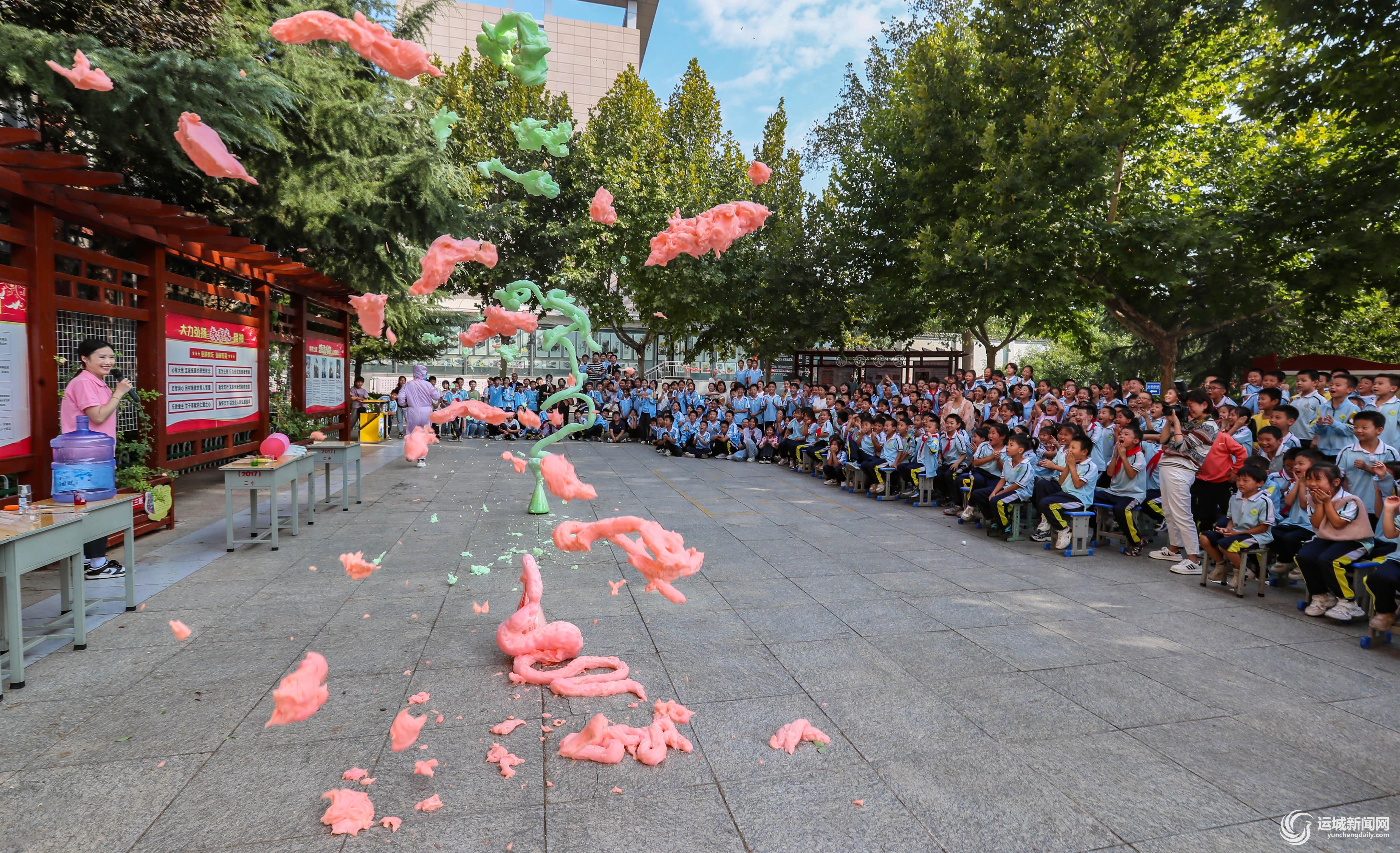 借助“魔术”这个喜闻乐见的载体,把科学知识传播给青少年。在实验中,老师施展“科学魔法”,上演了“分不开的书”“火纸和泡沫火焰”“奇妙的音乐”“大象牙膏”“神奇的液氮”等科学实验。神奇的化学反应,有趣的物理变化,一个个科普实验将原本枯燥乏味的理论知识瞬间转化为妙趣横生的实践表演,引得孩子们阵阵欢呼。其中,“大象牙膏”实验尤为引人注目,只见实验员手捧一杯特制的液体,慢慢倒入锥形杯中,轰的一下“牙膏”迅速冲出杯口,冲向上空,这一幕让在场的所有人惊叹连连,现场气氛瞬间被点燃。这是在夏县第二示范小学举行的“科普进校园”公开课实验活动的场景。
