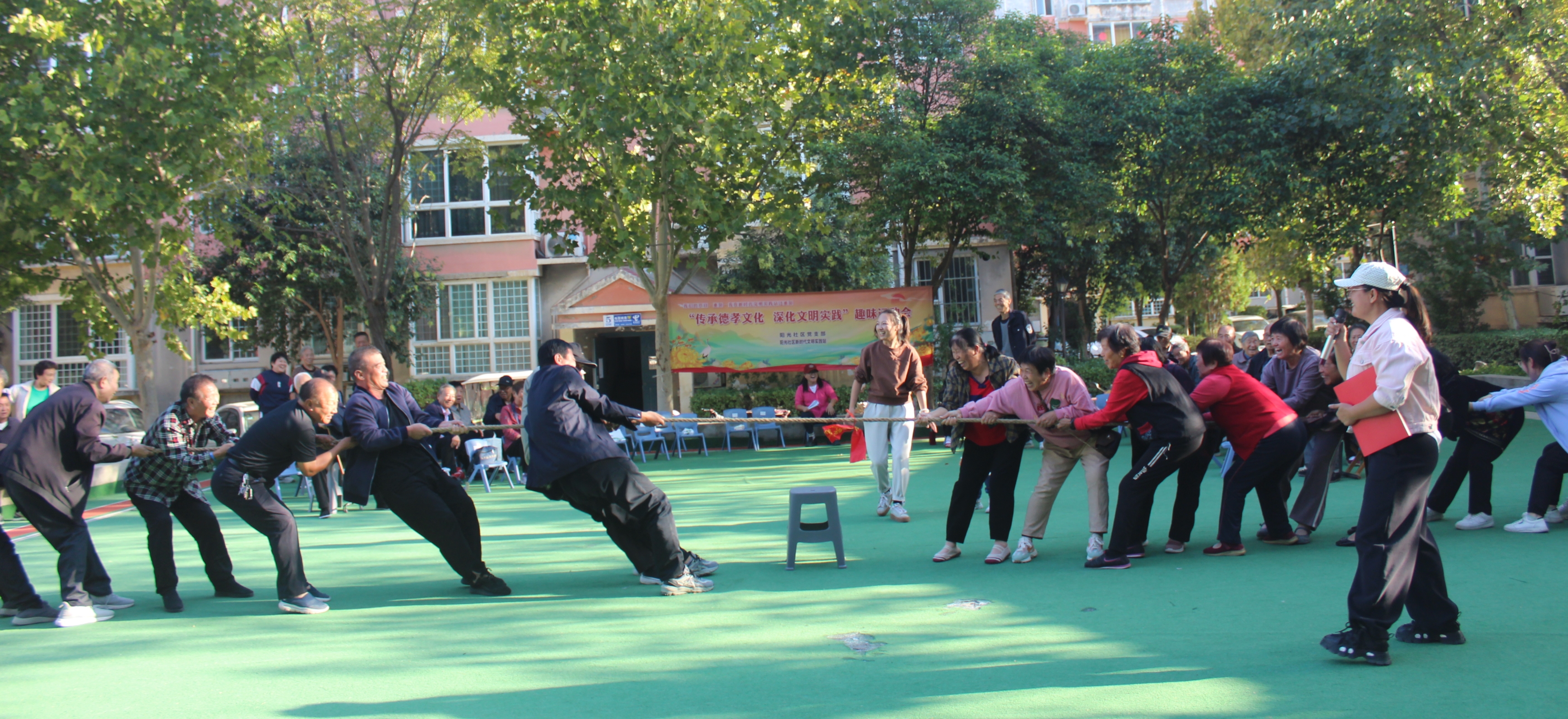 运动会设有套圈、托球折返跑、“双龙戏珠”、趣味保龄球、拔河等项目。套圈场上,老年人使出浑身解数,将手中的套圈抛出,每当套圈如飞镖般套中奖品,现场就会传出阵阵欢呼声;趣味保龄球也是老年人感兴趣的项目,砸中目标,围观群众一阵高呼,砸偏了则一阵唏嘘;拔河比赛场面异常激烈,老人们紧握绳子,高喊口号,拼尽全力往后拉,将此次运动会推向高潮。