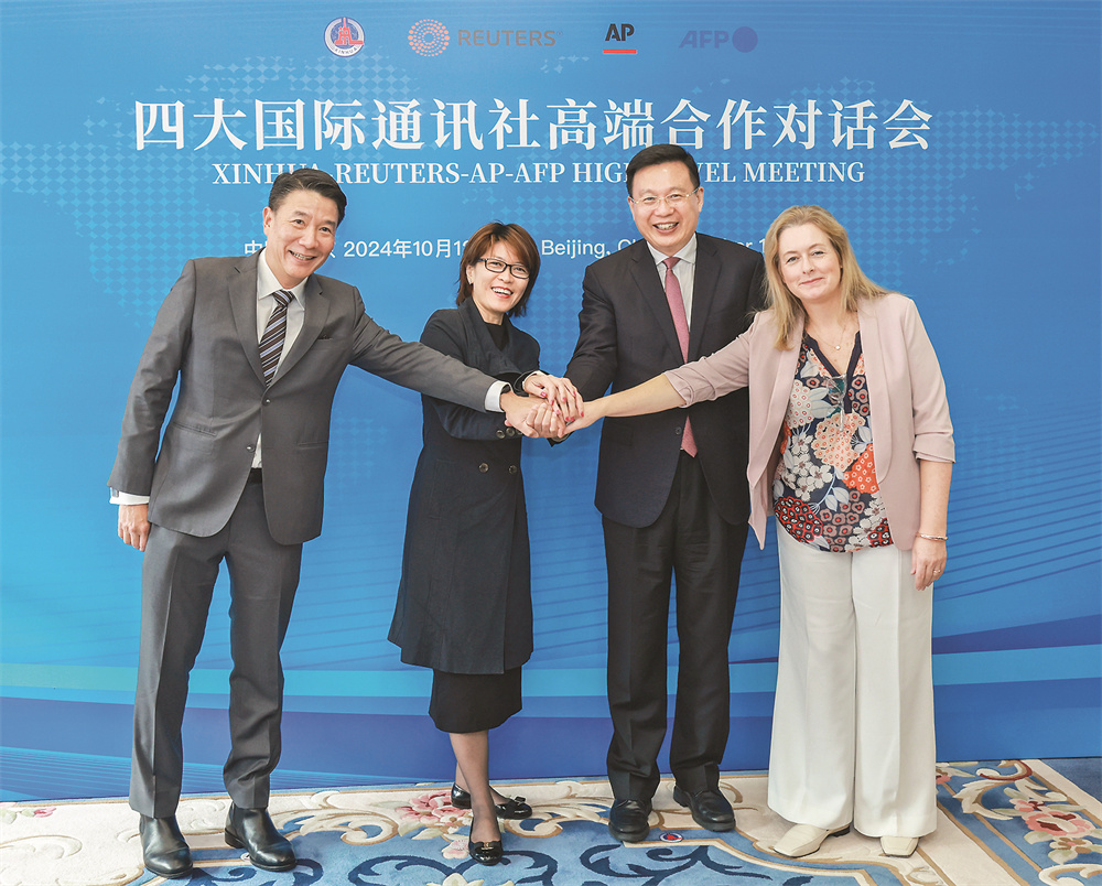 10月12日,新华社、路透社、美联社、法新社在北京举行四大国际通讯社高端合作对话会,共商人工智能背景下媒体发展。新华社社长傅华同路透社、美联社、法新社相关负责人举行会谈。新华社记者 王 晔 摄