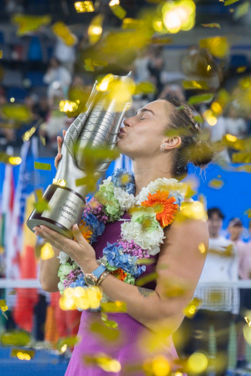 10月13日,萨巴伦卡在颁奖仪式上亲吻奖杯。 当日,在2024年WTA武汉网球公开赛女单决赛中,白俄罗斯选手萨巴伦卡2比1战胜中国选手郑钦文,夺得冠军。