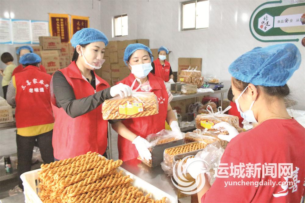 10月12日,位于闻喜县东镇蔬菜批发市场的“三喜家”食品有限公司车间里,员工忙碌地包装麻花。