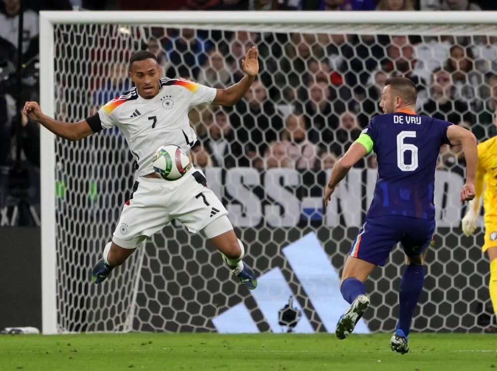 10月14日,德国队球员勒威林与荷兰队球员拼抢。
